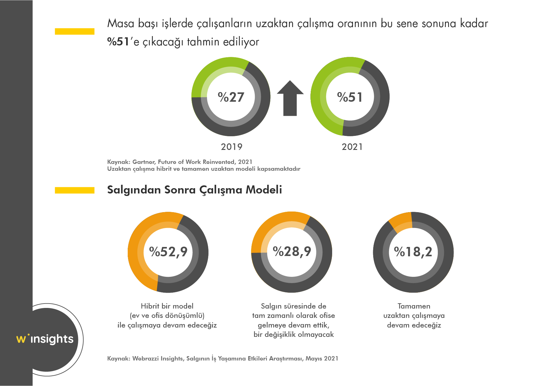 2021 sonlarına kadar masa başı işlerde çalışanların yarısının uzaktan ya da hibrit olarak çalışacağı; bu segmentin toplam iş gücünün %32'sini temsil edeceği tahmin ediliyor. Daha önceleri bir ayrıcalık ya da ek fayda olarak görülen uzaktan çalışmanın salgın nedeniyle yeni bir yaşam tarzına dönüşmesi ile birlikte de işletmelerdeki kurumsal kültürün de değişmesi bekleniyor.