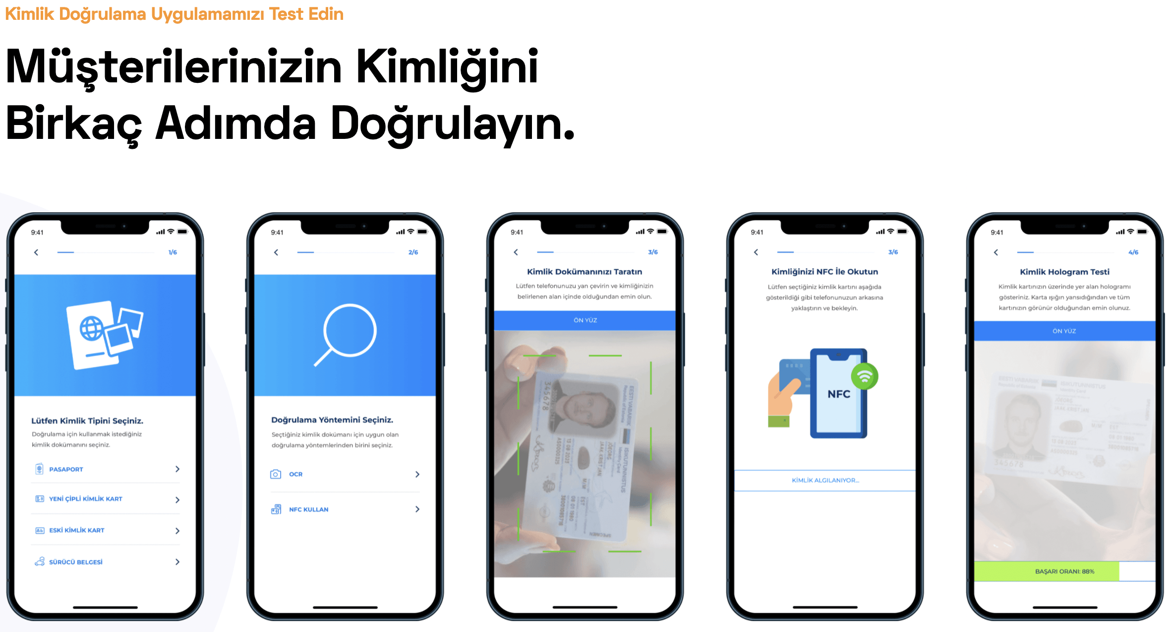 - Tüm kimlik tiplerine uyumlu OCR ve NFC doğrulaması