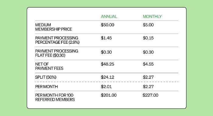 Medium'a herhangi bir ödeme yapmayan, yani abonelik oluşturmamış bir okuyucu, bir yazarın e-postasına abone olduğunda ise o okuyucuya otomatik olarak yazar üzerinden üye olma linki gönderilecek. Bu noktada okuyucunun abone olma zorunluluğu bulunmuyor, fakat eğer üye olursa yazar bundan da para kazanabilecek. Medium, abone tavsiye kazançlarının, üye okuma süresine dayalı kazançlara ek olacağını belirtti. Bununla birlikte, gelirlerinin yarısı yönlendiren yazara gideceğinden, Medium'un yönlendirilen abonelerden elde edeceği gelir de düşmüş olacak.