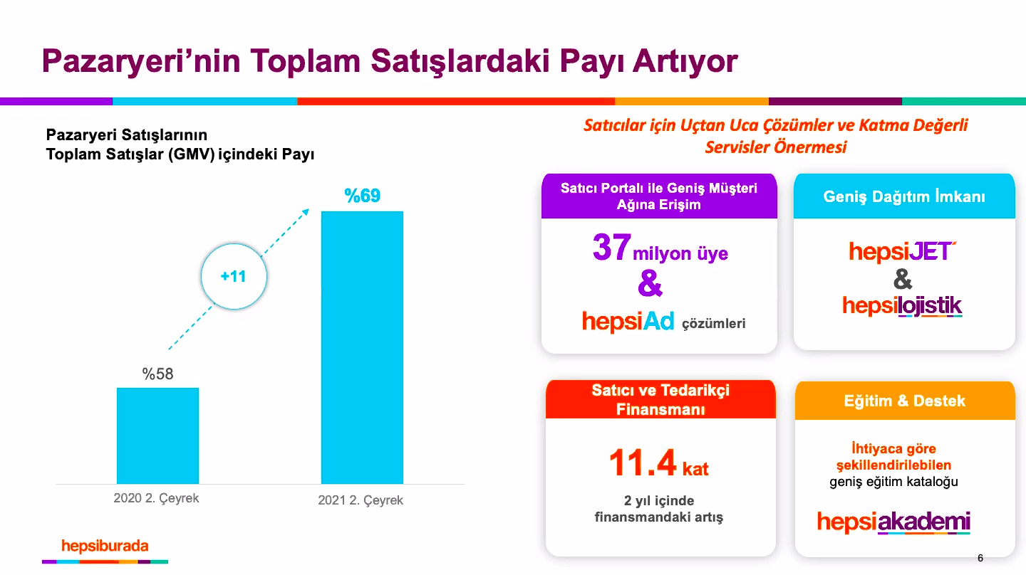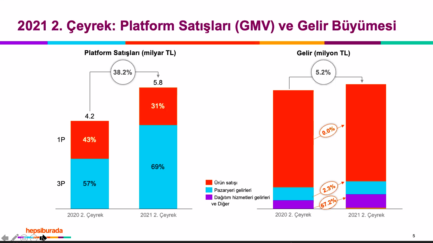 Pazar yeri satışlarının platform satışları içindeki payı (Share of Marketplace GMV) ise 2020'nin ikinci çeyreğinde yüzde 58 iken 2021'de yüzde 69'a ulaştı. Şirketin gelirleri ise 2020'nin ikinci çeyreğine kıyasla yüzde 5.2 büyüyerek 1,754.7 milyon TL'ye ulaştı. Raporda pazaryeri gelirleri artışı dikkat çekerken, dağıtım hizmetlerinde yüzde 67.2'lik büyüme öne çıkıyor.