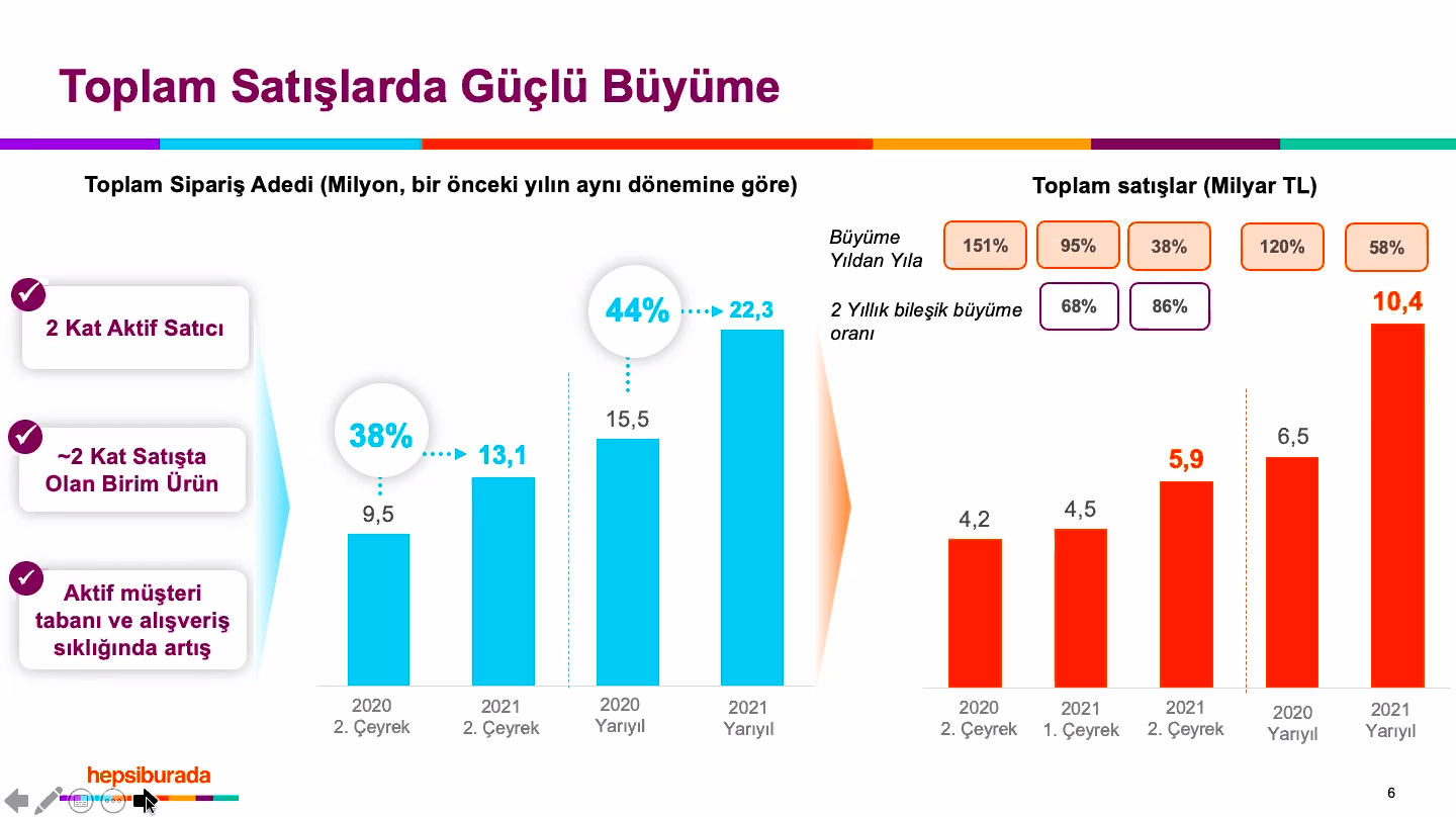 Paylaşılan rakamlara göre şirketin Platform Satışları (GMV) 2020'nin ikinci çeyreğinde yüzde 38.2 büyüme göstererek 5.9 milyar TL'ye ulaştı. Üstelik bu satışlara, Hepsiexpress satışlarının da dahil olduğunu belirteliö. Şirketin bu finansal noktaya Covid-19 şartlarında eriştiğini belirtmekte fayda var. 2021'in ilk 6 ayında ise Platform Satışları, 2020'nin aynı dönemine kıyasla yüzde 58.2 büyüme gösterdi.