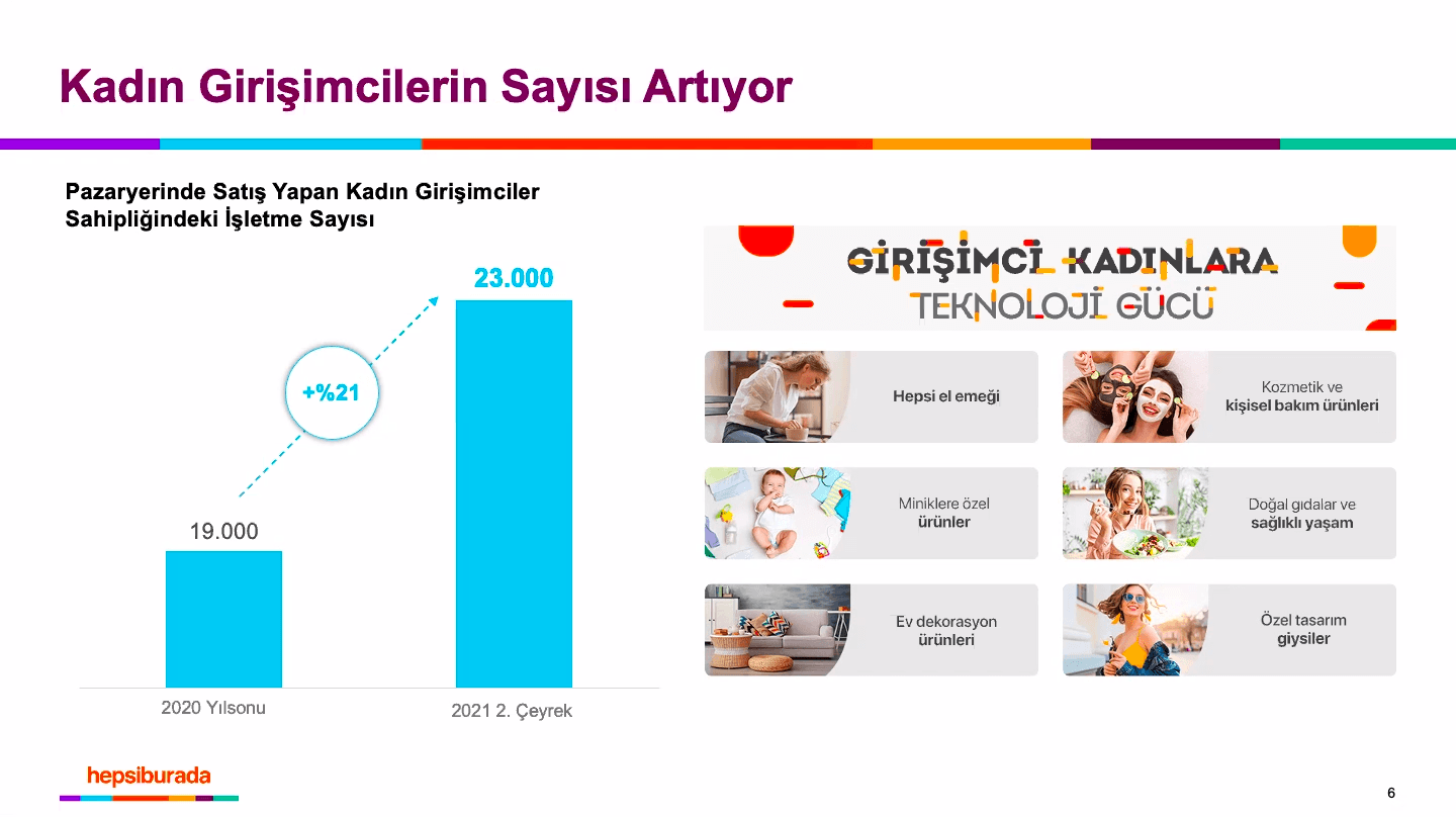 Platformdaki kadın girişimcilerin sayısı da artıyor. 2020 yıl sonunda 19 bin olan Hepsiburada'daki kadın girişimcilerin sayısı 2021'in ikinci çeyreğinde yüzde 21 artış ile 23 bine yükseldi. Platform, 2021 yılında 28-29 milyar TL satış hacmine ulaşmayı planlanıyor.