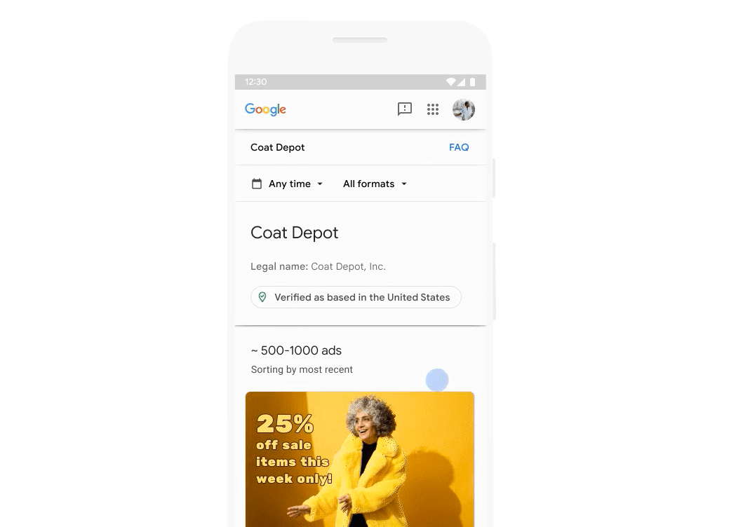 Google'ın duyurduğu bir başka yenilik de Reklamveren sayfaları oldu. Kullanıcılar “About this ad” menüsü üzerinden "bu reklamverenden daha fazla reklam gör" kısmına basarak, reklamverenin son 30 günde yayınladığı tüm reklamlara erişebilecek.