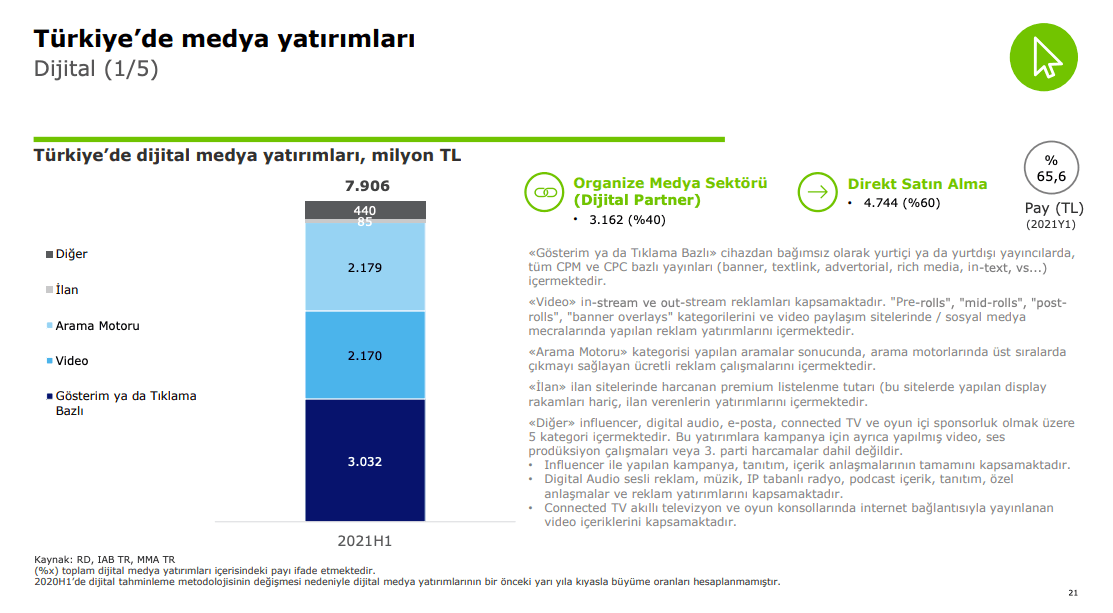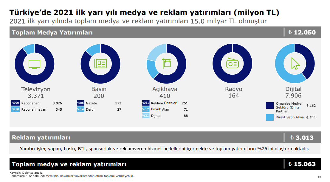 Dijital yatırımlar altında bulunan organize medya sektörü (dijital partner) ve direkt satın alma kırılımı, ana toplamda da Türkiye Medya Sektörü ve Türkiye Toplam Medya Pazarı tanımlarını yaratmıştır. Türkiye’de Medya Yatırımları 2021 Yılı İlk 6 Ay Raporu’na göre, medya yatırımları 7 milyar 306 milyon TL olarak gerçekleşti. Yaratıcı işler, yapım, baskı, BTL, sponsorluk ve reklamveren hizmet bedellerinin oluşturduğu reklam yatırımları ise 3 milyar 13 milyon TL oldu. Türkiye Toplam Medya Pazarı’na yapılan yatırım ise 12 milyar 50 milyon olarak gerçekleşti.