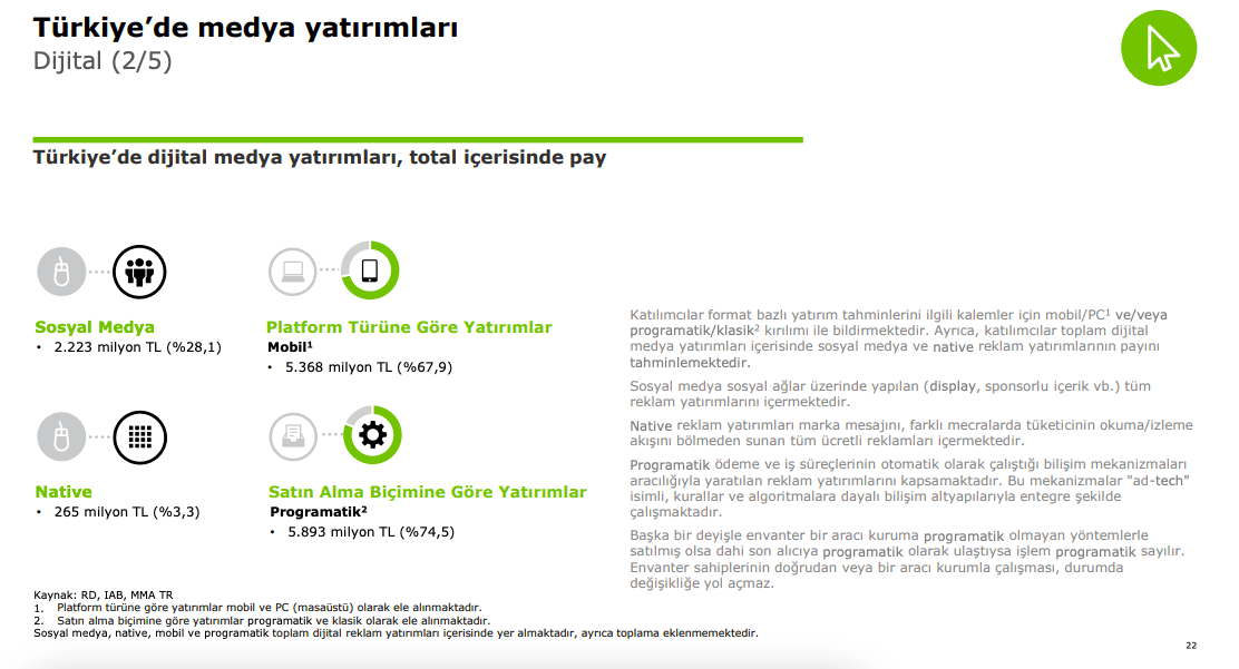Dijital medya yatırımlarında bu sene değişen metodoloji ile dijital medya yatırımları organize medya sektörü (dijital partner) ve direkt satın alma olarak iki ayrı başlıkta açıklandı. Tüketim alışkanlıklarının, COVİD-19 ile dijital kanallara kayması, bu mecradaki yatırımları olumlu yönde etkiledi. Türkiye’deki Medya Yatırımları içerisinde yüzde 65,6 oranında paya sahip dijital medya yatırımları, bu yılın ilk 6 ayında 7 milyar 906 milyon TL seviyesine ulaştı.