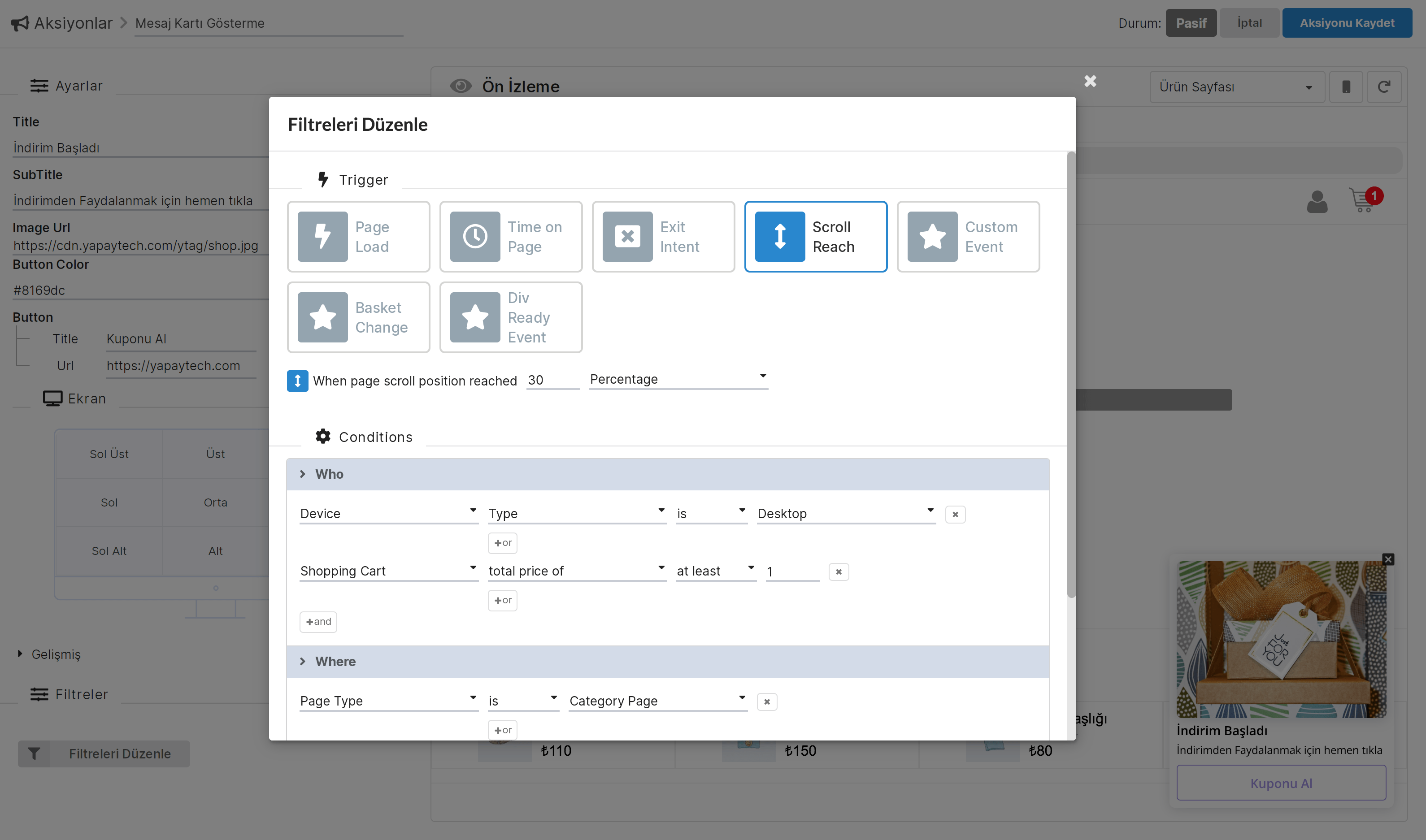 CollectAction içinde yer alan uygulamalar arasında kartlar (Çarkıfelek, İndirim Popupları, Ürün Yağdırma, Mesaj Kartları), sepet hatırlatma (Push, Mail, Mesaj, WhatsApp), sosyal etki, anket & geri bildirim aracı, e-ticaret asistanı (Satış Öncesi ve Sonrası), ürün öneri ve WhatsApp satış platformu gibi seçenekler bulunuyor.