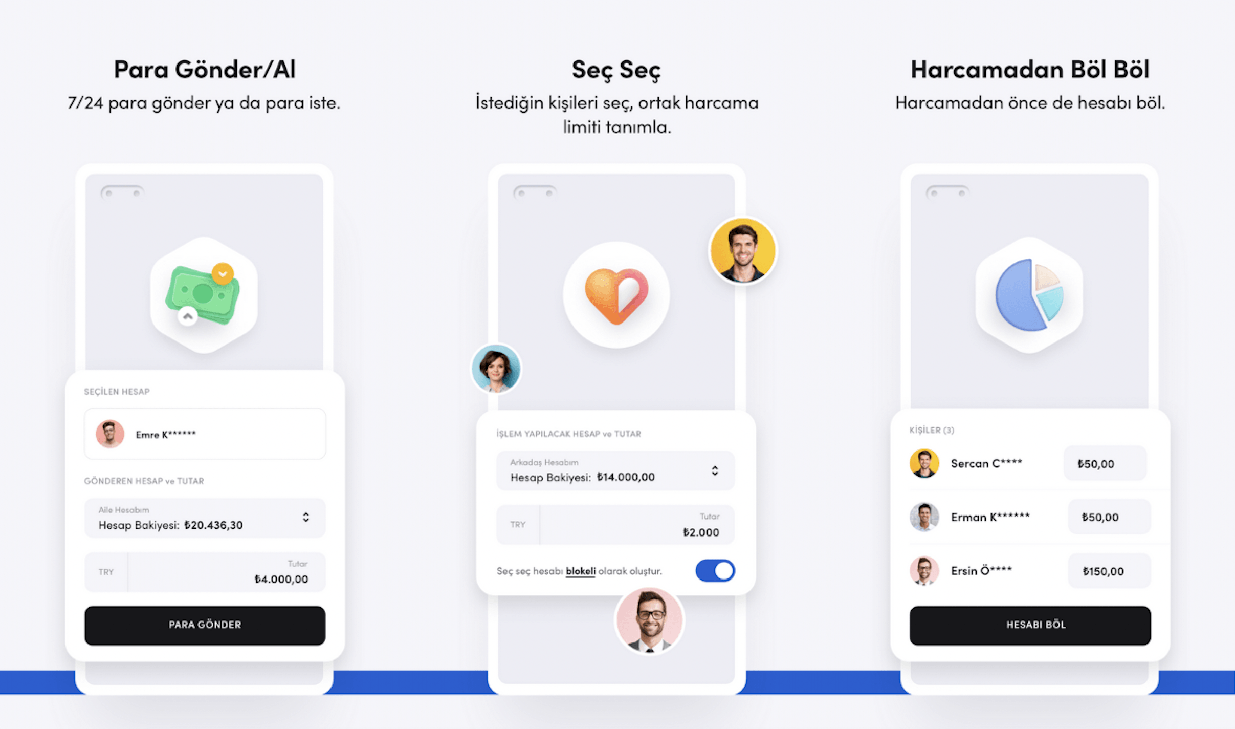 Bir FUPS hesabı üzerinden farklı kullanıcılara farklı kullanım limitleri açılmasına olanak veren patentli Seç Seç Hesap özelliği, aile bütçesini kontrol etmek isteyen ebeveynleri ve harçlığını garantilemek isteyen çocukları hedefliyor. Harcamadan Böl Böl özelliği ise grupça yapılacak bir harcamanın herkese eşit bölünmesini sağlıyor.