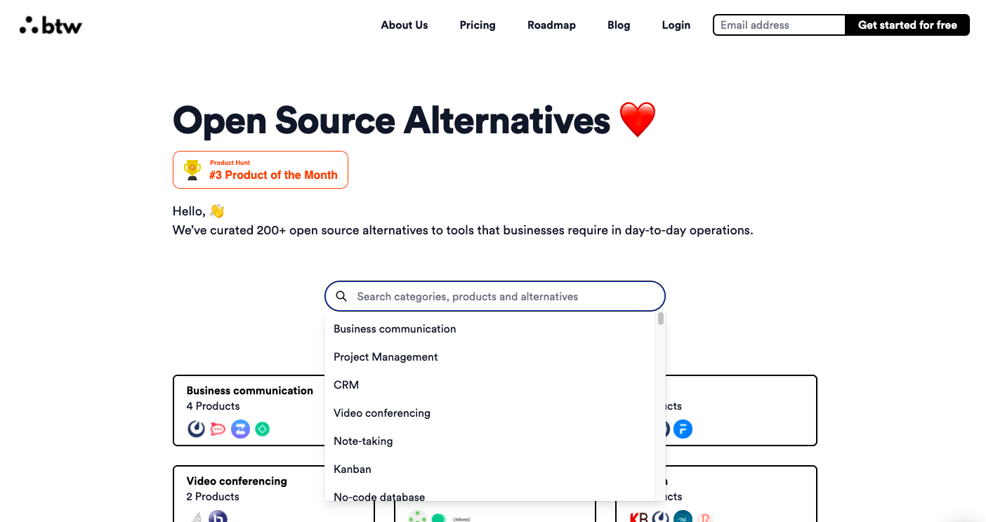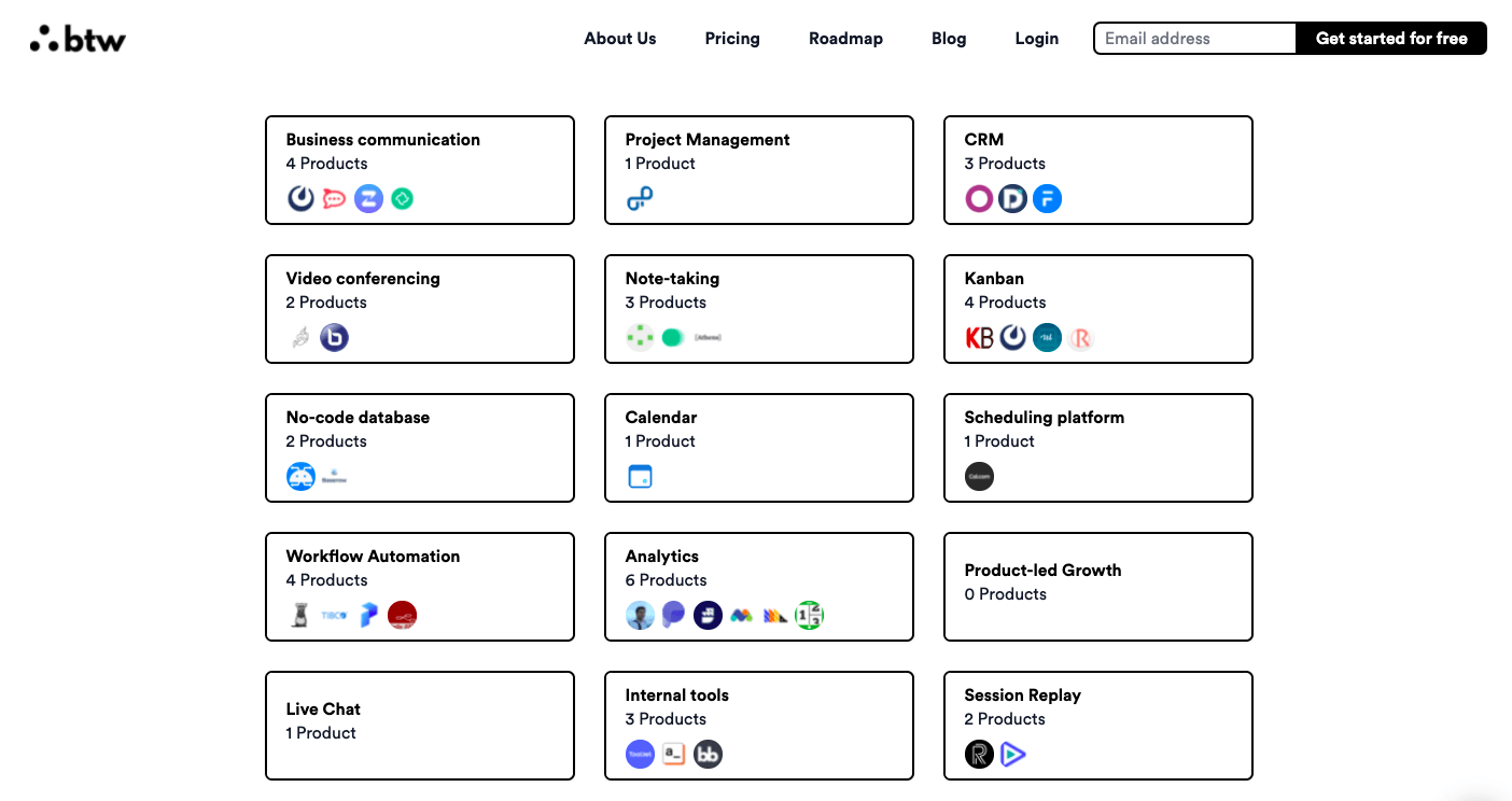 Ürün odaklı pazarlama platformu btw, sitesinde 200'den fazla B2B aracını listeliyor. B2B araçların açık kaynaklı alternatiflerini, proje yönetimi, video konferans, CRM ve CMS gibi yaklaşık 40 kategoriye ayran bu liste adeta bir kütüphane görevi görüyor.