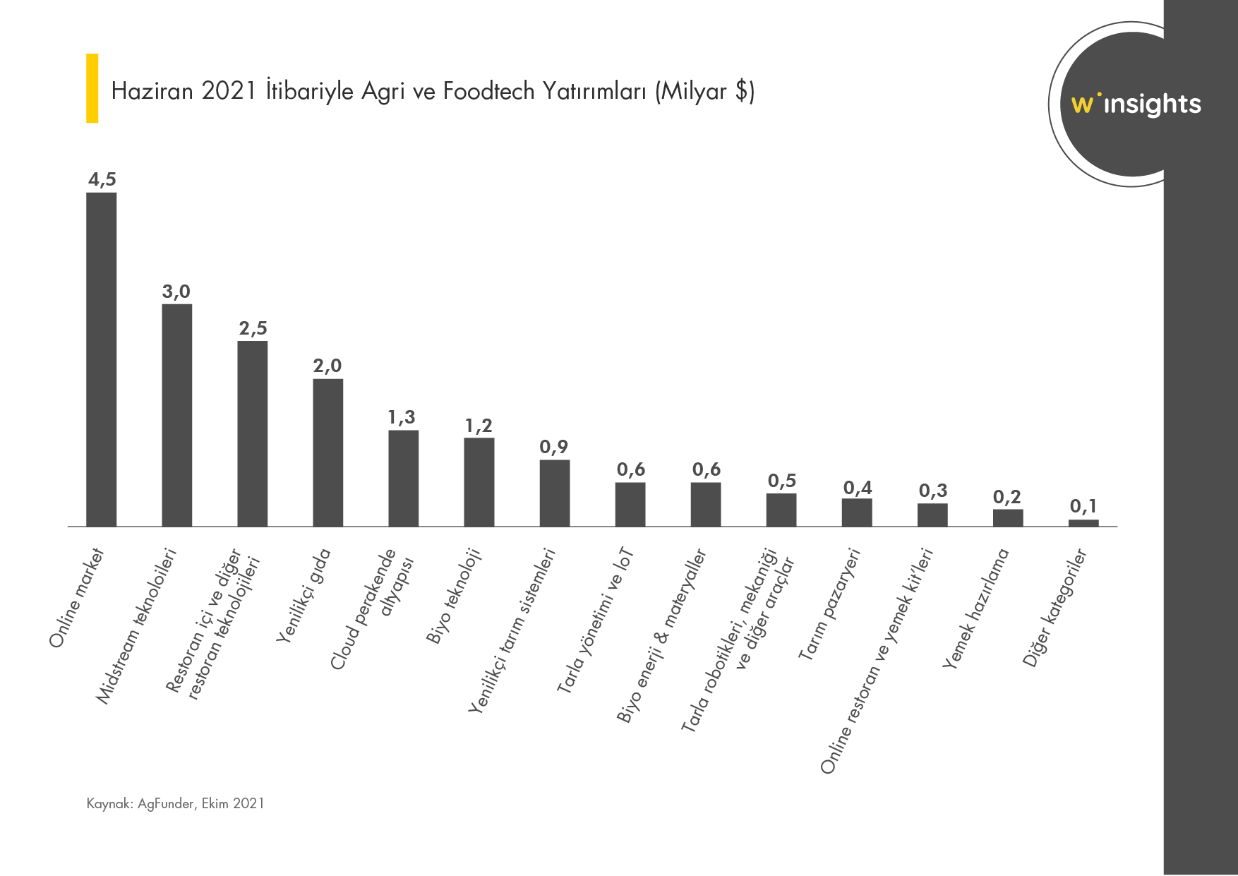 ABD ve Çin'in başı çektiği listede Getir'in aldığı büyük yatırım ile Türkiye'nin de sıralamada 4. olduğunu görmekteyiz. Online market alışverişi, hızlı teslimat ve restoranların sektörün büyük bir bölümünü kapsaması devam etmekle birlikte tarım ve buna bağlı olan sektörleri geliştirecek kategorilerin de yatırım aldığı görülmekte.