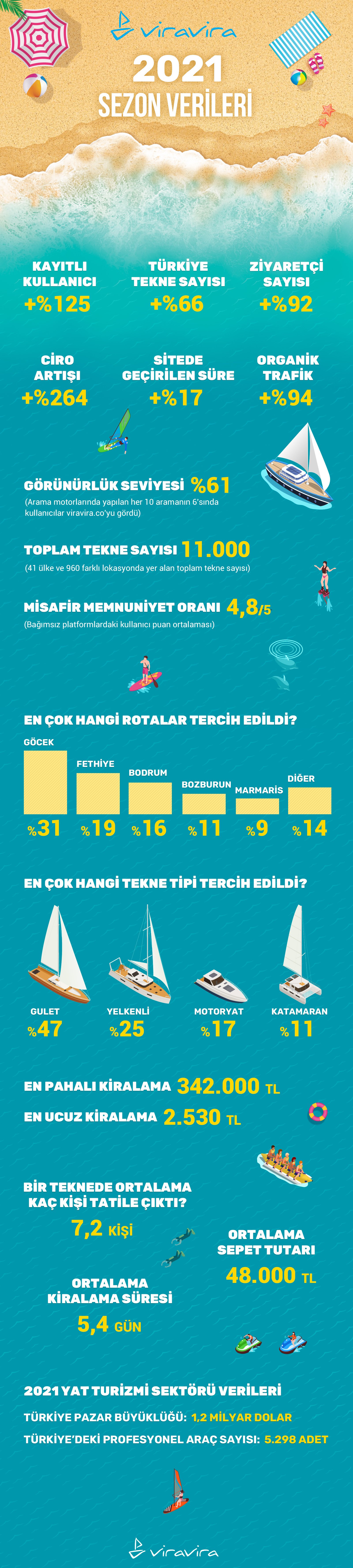 41 ülkede 11 bin kiralık tekne ile hizmet veren Viravira'nın verilerine göre 2021 yılında sitenin kayıtlı kullanıcıları yüzde 125, platformda yer alan Türkiye'deki tekne sayısı yüzde 66 ve ziyaretçi sayısı ise yüzde 92 oranında arttı.