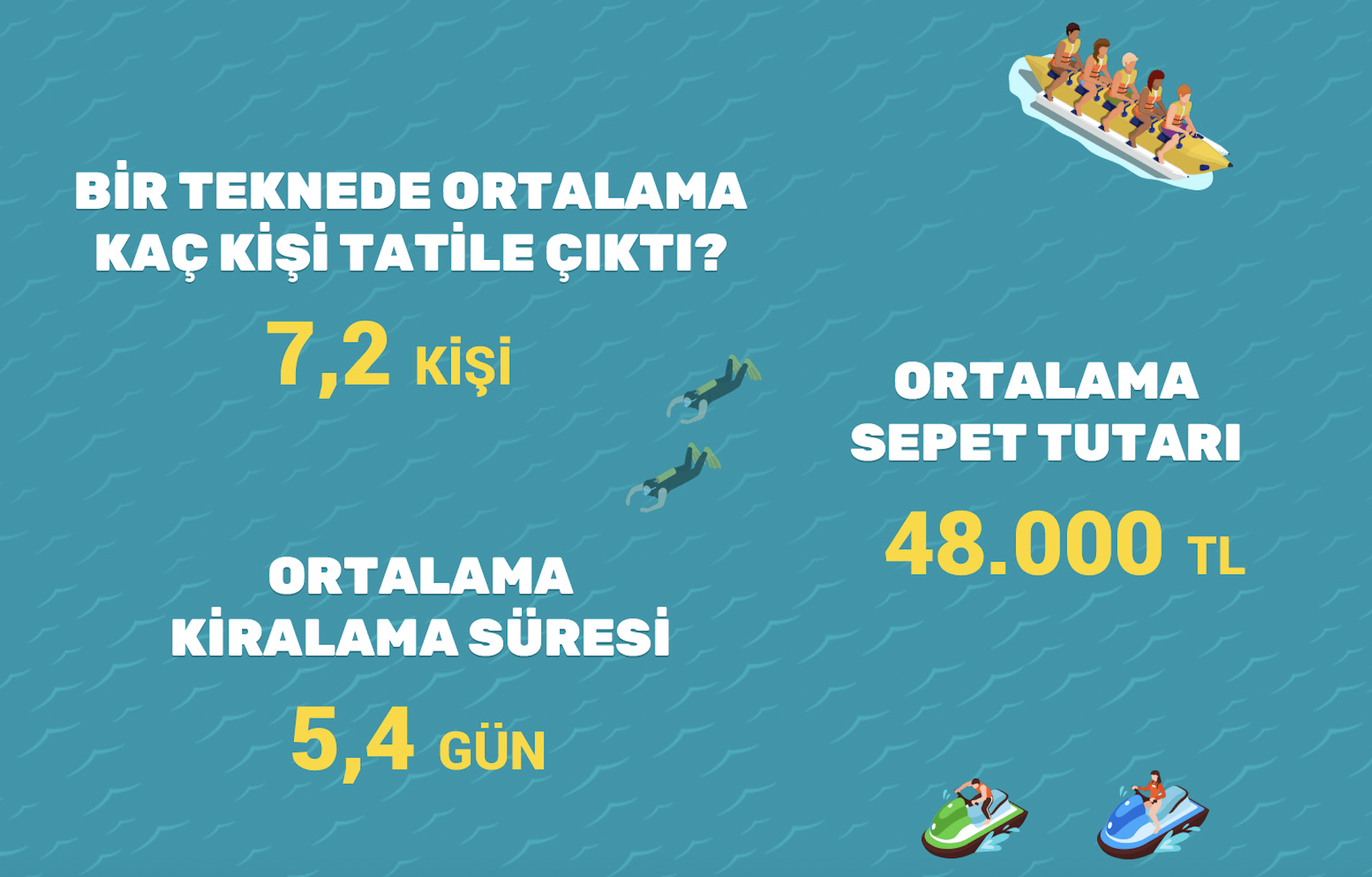 Viravira kullanıcıları sezon boyunca ortalama 5,4 günlük kiralamalar gerçekleştirdiler. Bir teknede tatil yapan ortalama kişi sayısı ise 7,2 kişi. Viravira platformunda 2021 yazında gerçekleşen en pahalı kiralama ise 342 bin TL, en ucuz kiralama ise 2 bin 530 TL oldu. Ortalama sepet tutarı ise 48 bin TL.