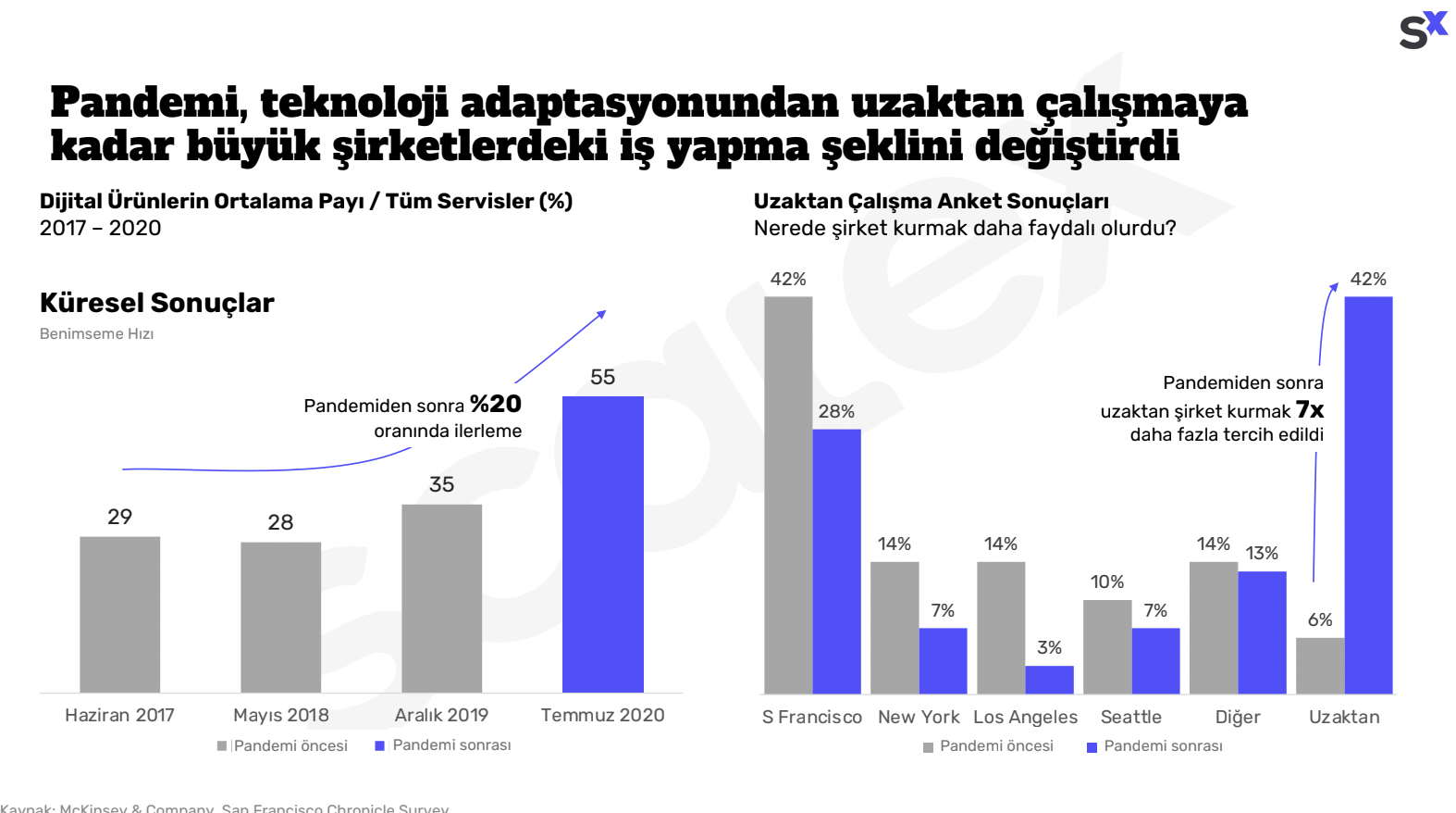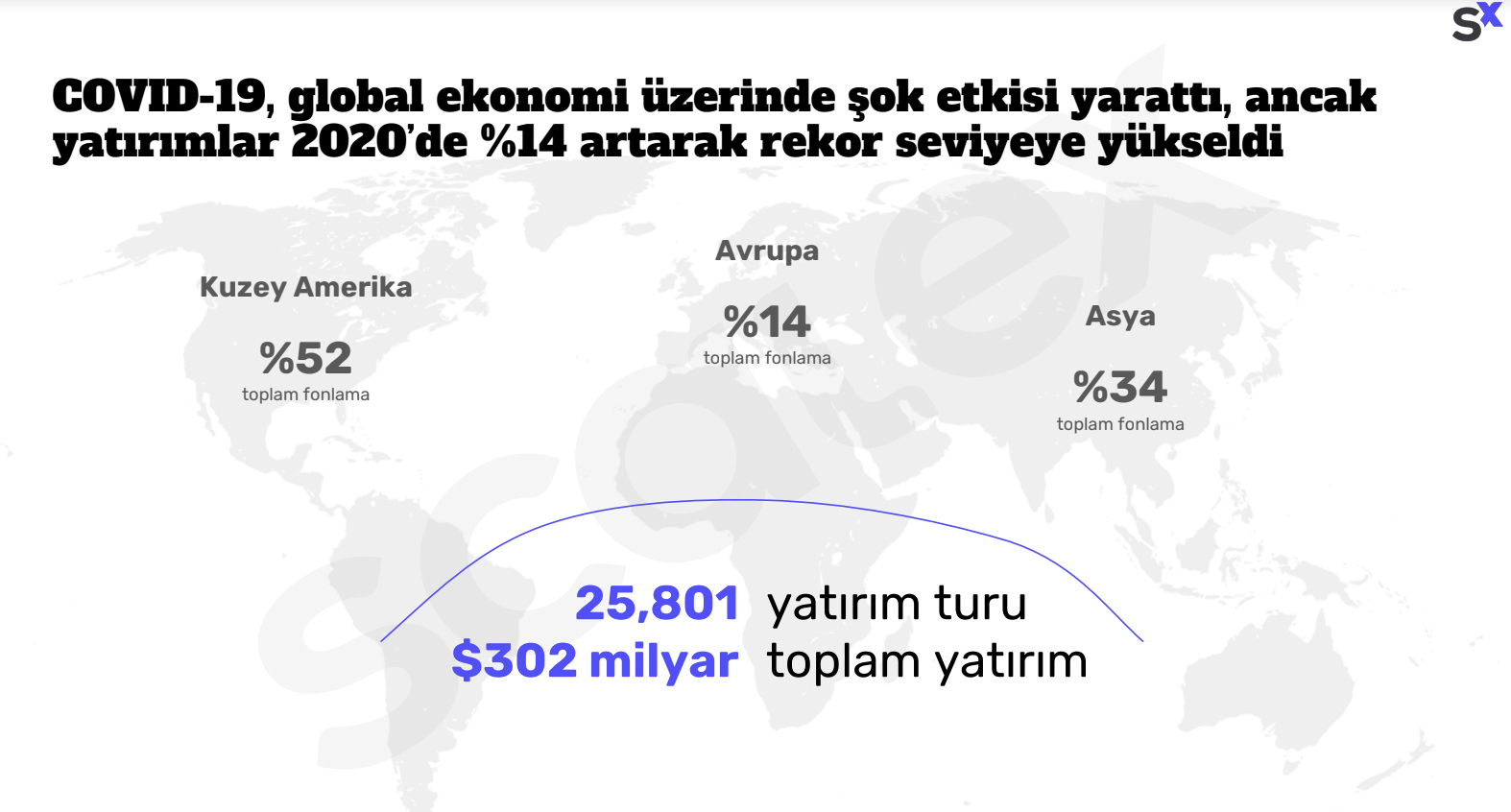 Buna göre 2020’de Kuzey Amerika (yüzde 52), Asya (yüzde 34) ve Avrupa'da (yüzde 14) toplamda 302 milyar dolar değerinde 25 bin 801 yatırım ile yıllık bazda yüzde 14 büyüme kaydedildi. Bu dönemde yaşanan en önemli değişiklik, dijital dünyanın benimsenmesi ve uzaktan çalışma sayesinde iş yapma şeklinin tamamen değişmesiydi. Buna en büyük örnek olarak girişimciler, pandemi döneminden sonra işlerine, önceki döneme kıyasla 7 kat daha fazla uzaktan başlıyor.