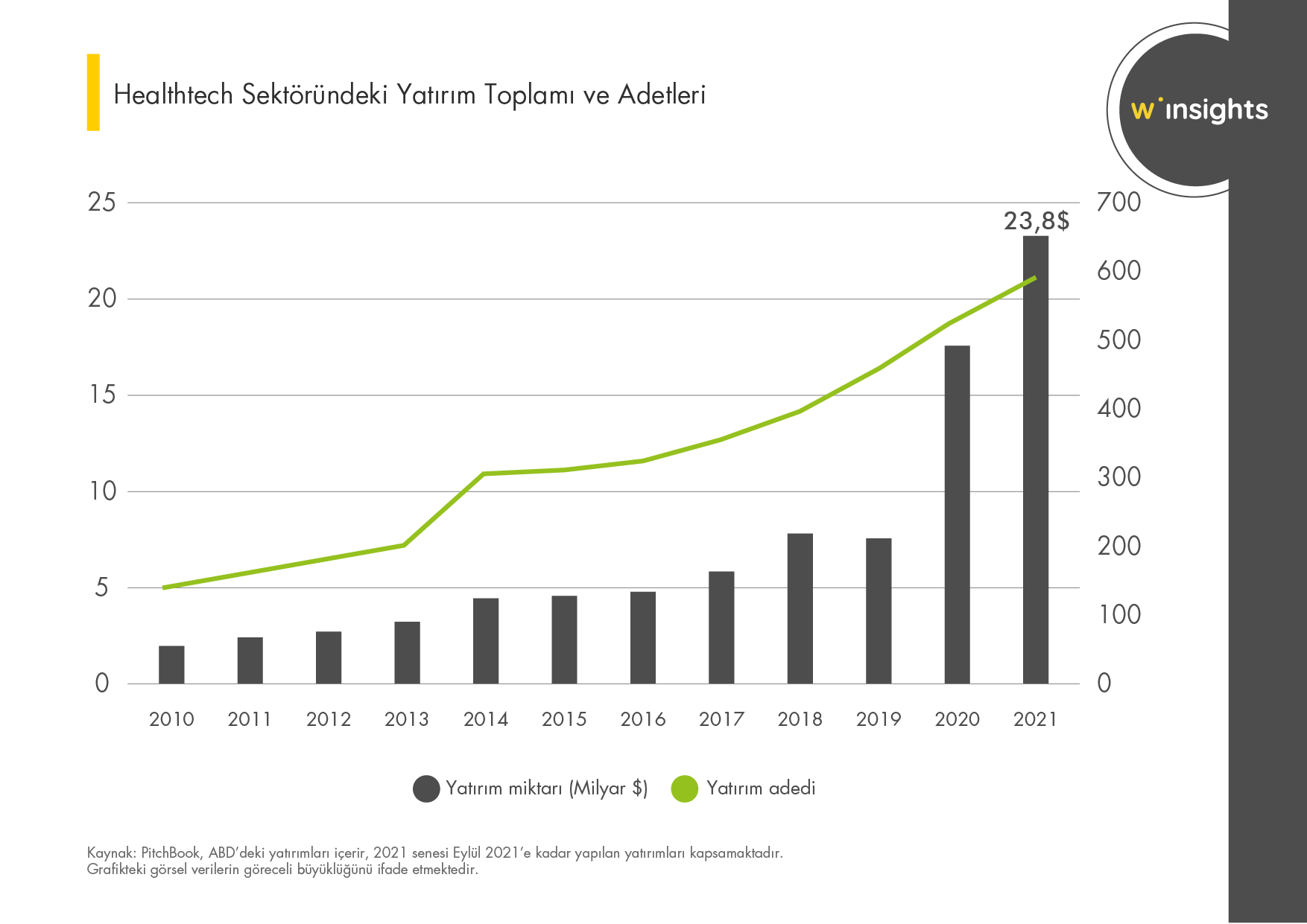 Salgının başında sayısının arttığını gördüğümüz mobil ve uzaktan sağlık girişimlerine ilgi hala devam etmekle birlikte yüz yüze muayenelerin başlaması ile healthtech yatırımlarının 2020'de yaşadığı hızlı ivmenin korunmadığını da görmekteyiz. Yine de 24 milyar $ ile bugüne kadar yapılan en yüksek yatırımların görüldüğü sektörde girişimlerle birlikte daha kurumsallaşmış şirketlerin de hamleleri takip ediliyor.