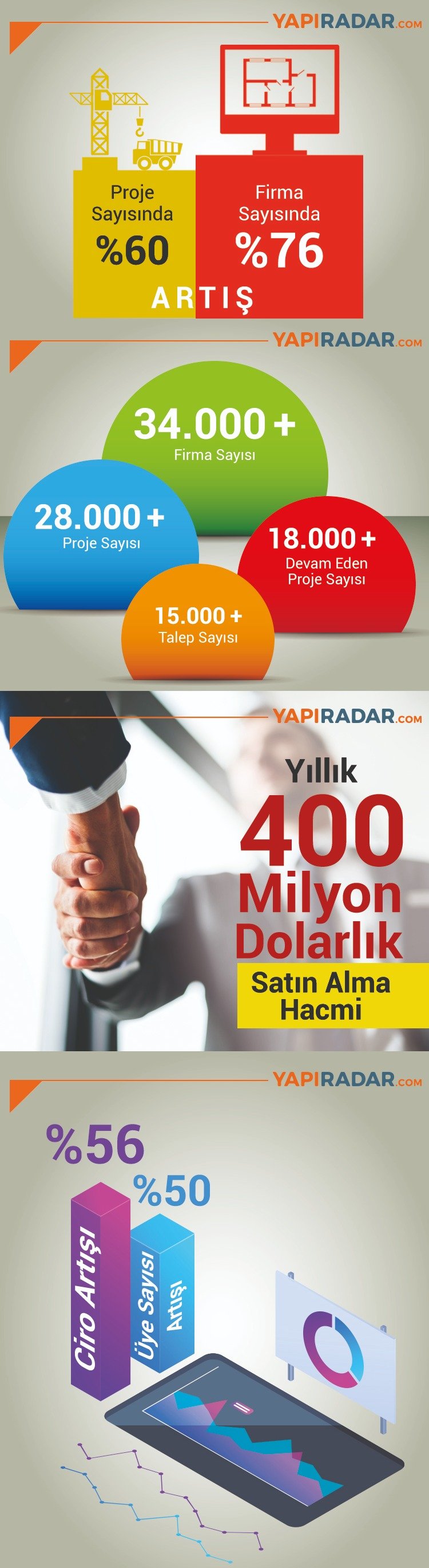 İnşaat teknolojileri girişimi Yapiradar.com, 2021 yılını ekonomide yaşanan tüm zorluklara rağmen, bir önceki yıl ile kıyaslandığında üye sayısını yüzde 50, cirosunu da yüzde 56 oranında artırmış durumda. Yine 2021 yılı sonu itibarıyla, sahadan gelen bilgilerin katkısı ile kurumsal üyelerine 28 binden fazla proje sunan Yapiradar.com, 18 bin üzerinde güncel projeye ek olarak, 34 binin üzerinde yatırımcı, müteahhit, mimar ve diğer çözüm ortağı firma bilgilerine sahip. Bu noktada Yapiradar.com'un son bir yılda proje sayısında yüzde 60, kayıtlı çözüm ortağı sayısında ise yüzde 76’lık bir gelişim gösterdiğini de belirtmek gerek.
