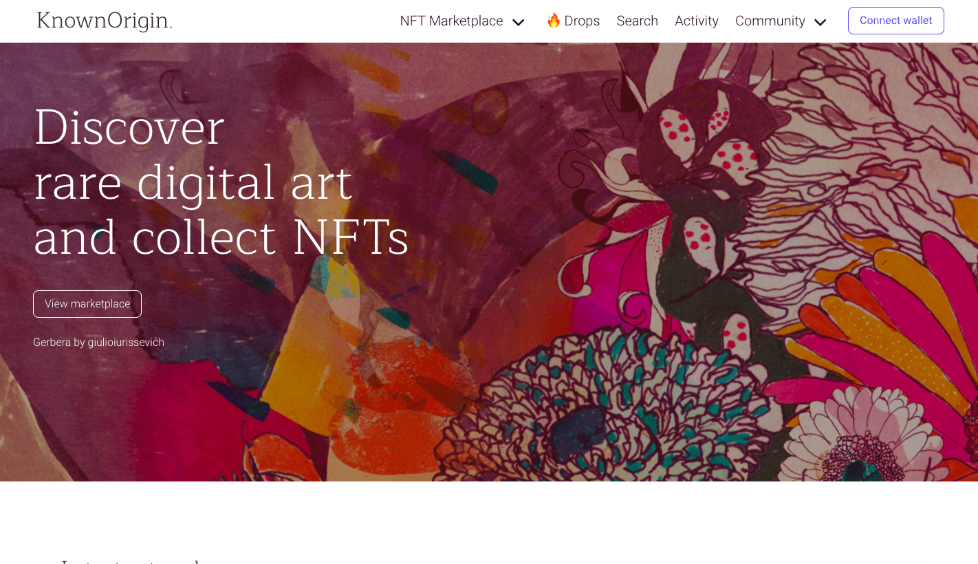 NFT pazarının kıdemli isimlerinden KnownOrigin de yalnızca nadir sanat eserlerine odaklanmakla kalmıyor, aynı zamanda koleksiyonerleri yüksek kalitede sanat eserleriyle buluşturuyor. Sınırlı sayıda "NFT drop"ları yayınlamasıyla tanınan platform, kürasyonu da önemsiyor. KnownOrigin ile özenle seçilen NFT edisyonlarına erişmek mümkün. Tıpkı nadirliğe ve sanatçılara odaklanan diğer platformlarda olduğu gibi bir başvuru ve araştırma sürecinden geçmeniz gerektiğini ekleyelim. Ethereum blokzincirinde çalıştığı için gaz ücretleri yüksek oluyor.