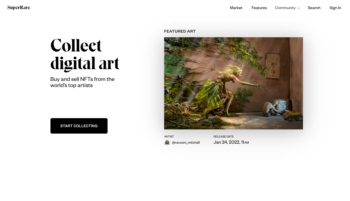 Tamamen dijital sanata oladaklanan SuperRare ise rakibi Rarible'ın aksine yalnızca Ethereum blokzincirinde çalışıyor. Adeta bir sanat galerisi izlenmi uyandıran platform, özenle seçilmiş sanat eserlerine ev sahipliği yapıyor. Galeri modu ve ilgi uyandıran blogu ile seçkin bir platform olarak öne çıkıyor. Geleneksel galerilerin NFT dünyasında vücut bulmuş hali diyebiliriz. Başvuran sanatçıların yalnızca yüzde 1'inin platforma kabul edilmesi ise SuperRare sanatına güvenenlerin adresi olarak konumlandırıyor.