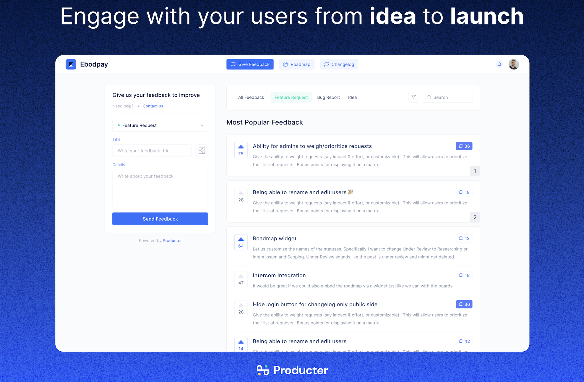 Kullanıcılardan geri bildirimler toplanması, görev yönetimi, yol haritaları oluşturma ve ürün güncellemelerini kullanıcılar ile otomatik olarak paylaşma gibi özellikler sunan Producter, bu özelliklerin yanı sıra ürün dokümantasyonun yapılması ve diğer ürünlerle entegrasyonlar gibi birçok ek özelliği de sahip durumda.