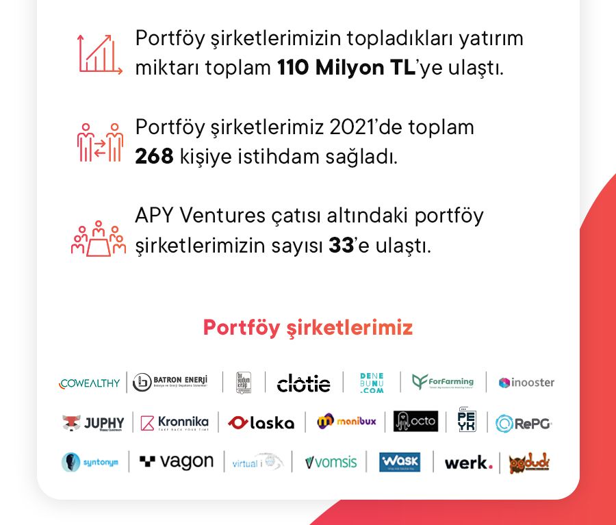 2021 yılında yapılan yeni yatırımlar ile birlikte APY Ventures'ın portföyünde yer alan şirket sayısı 33'e çıktı. APY Ventures'ın portföy şirketlerinin topladıkları yatırım 2021 yılında 110 milyon TL'ye ulaştı. Portföy şirketlerinin 2021 yılı içinde toplamda 268 kişiye istihdam sağladıklarını da belirtelim.