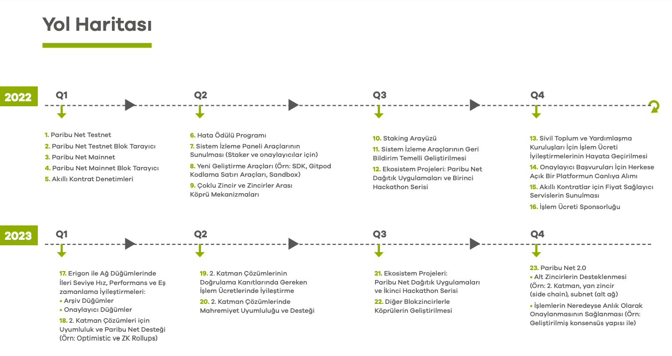 Şirketin paylaştığı yol haritasına göre 2022'nin ilk çeyreğinde Paribu Net Testnet, Paribu Net Testnet Blok Tarayıcı, Paribu Net Mainnet, Paribu Net Mainnet Blok Tarayıcı ve Akıllı Kontrat Denetimleri hayata geçecek.