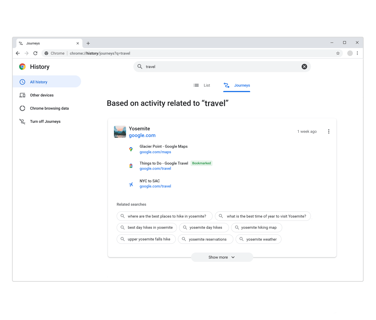 Bu yeni özellik, şimdi masaüstü için Chrome'da kullanıma sunuluyor ve geçmiş aramaları konuya göre akıllıca gruplayacak. İlgili bir terimi aramaya başladığınızda tarayıcı bu yeni deneyimi otomatik olarak vurgulayacak veya özelliği tarayıcınızda etkinleştirildikten sonra doğrudan yeni Chrome Geçmiş Yolculuğu sayfasına gidebileceksiniz.