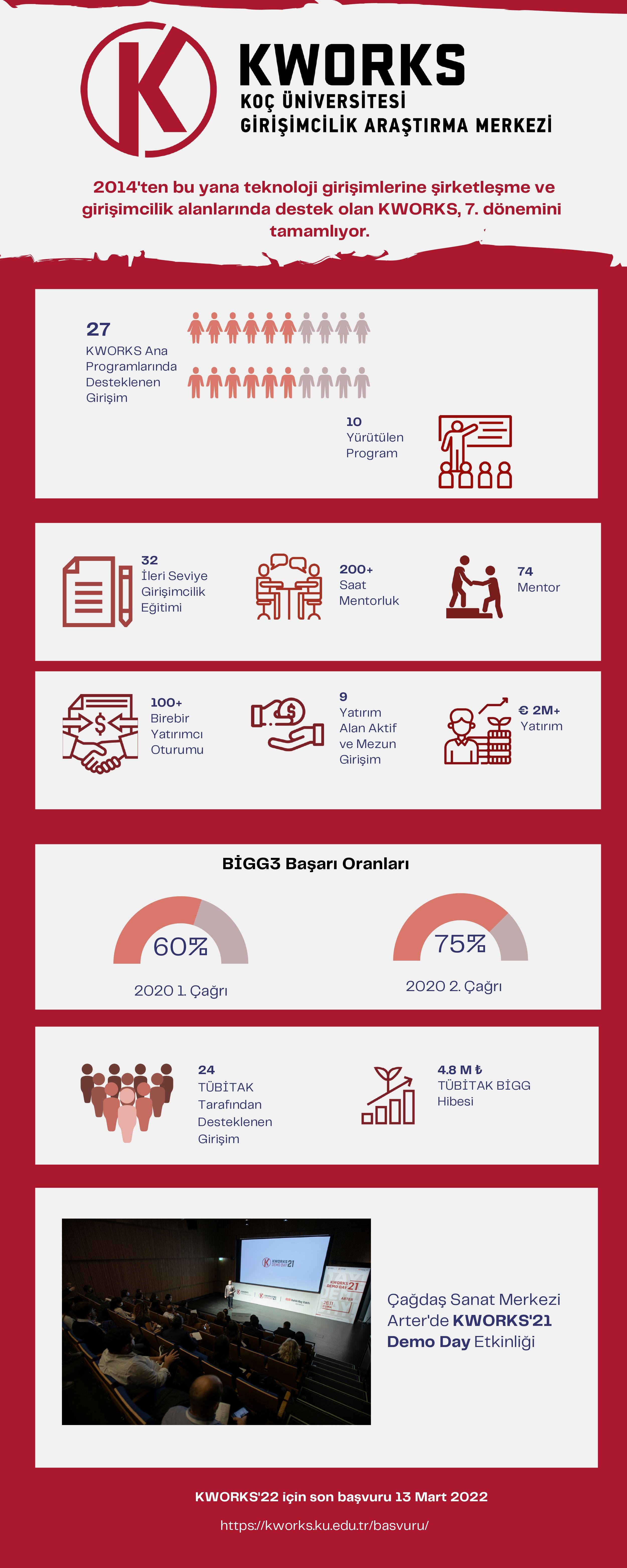 Koç Üniversitesi Girişimcilik Merkezi KWORKS’ün 2021 Hızlandırma programları, Hızlandırma, Ön Hızlandırma, Derin Teknoloji ve Kampüs Ön Hızlandırma olmak üzere 4 farklı odakta gerçekleştirildi. 300’ün üzerinde başvuru alan programlara 27 girişim seçildi. Bu girişimlerin 24’ü programlardan mezun olurken, 17’si Demo Day etkinliğinde sunum yapmaya hak kazandı. Demo Günü’nde sahneye çıkan 17 girişimin 8’i kurumsal bir şirket ile pilot çalışma, ortak iş geliştirme ve ortak ürün geliştirmeye yönelik iş birliği yaparken, sunum yapan 6 hızlandırma programı girişiminin 5’i program dönemi içerisinde fatura kesti.