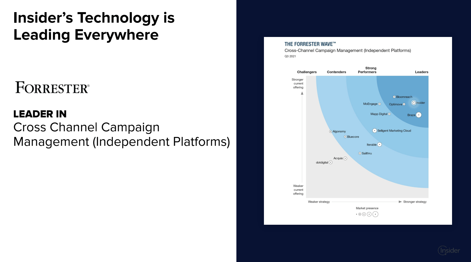 Hande Çilingir'in paylaştıklarına göre; 2021'in yeni gelirlerinde ABD ve Latin Amerika'nın gelirleri yüzde 30'u aştı. ABD rekabet ettikleri isimlerin önemli ihalelerde kafa kafaya geldiklerini belirtti. Çok kanallı pazarlama yönetimi alanında Insider'ın Salesforce, Braze ve Adobe gibi rakiplerini geride bıraktığını açıklarken, Forrester'ın yayınladığı rapora göre lider konumunda olduğunu sözlerine ekledi.
