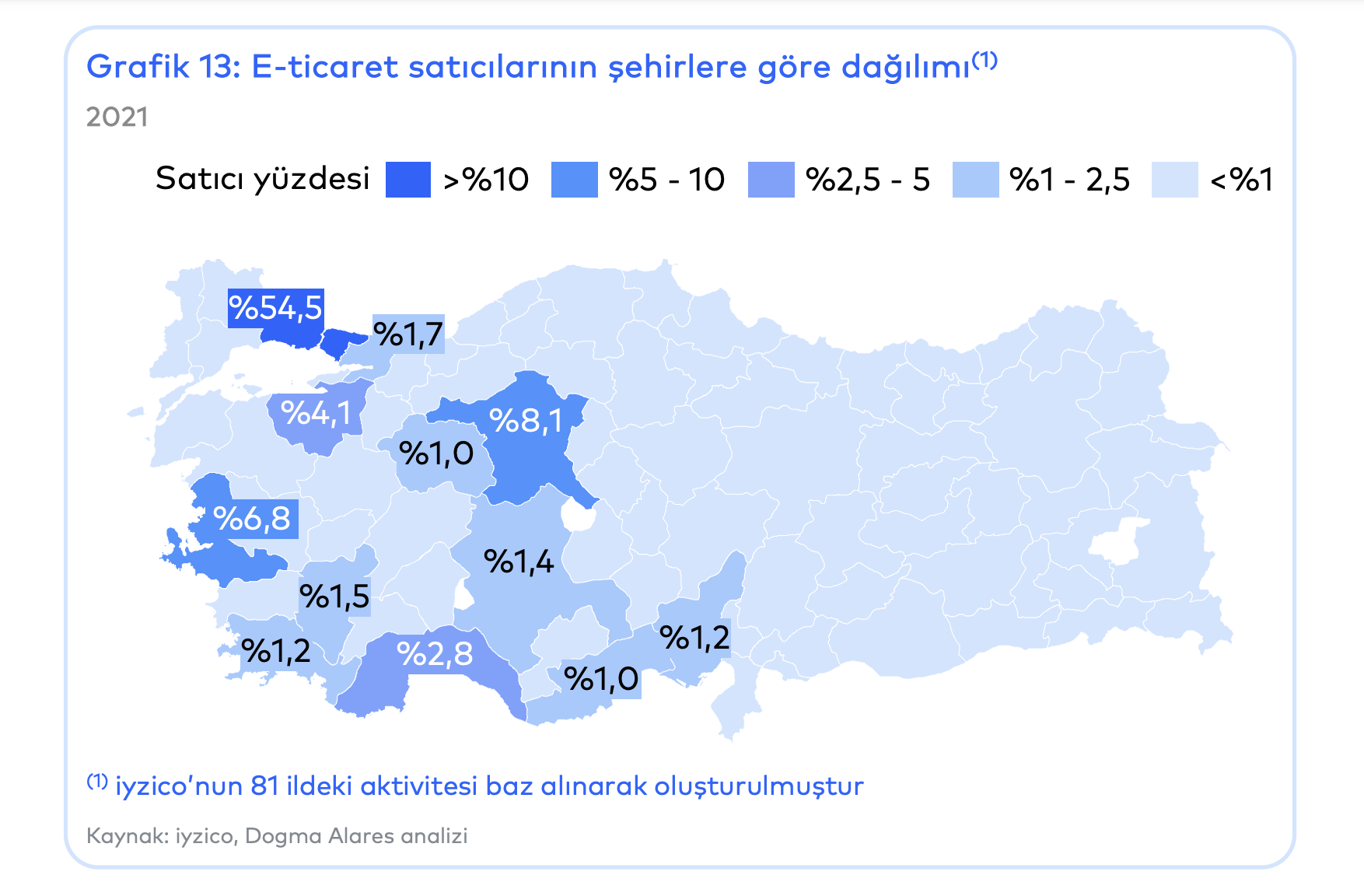 2017’den beri en fazla e-ticaret satıcısına ev sahipliği yapan illerimiz sırasıyla İstanbul, Ankara ve İzmir oldu. Onları Bursa ve Antalya takip etti. Bu 5 il, e- ticaret satıcılarının yüzde 75’inden fazlasını barındırıyor. 2017’den bu yana e- ticaret satıcılarının en yoğun olarak bulunduğu moda ve aksesuar sektörü olurken, ikinci sırada mobilya, züccaciye, tuhafiye sektörü, üçüncü sıradaysa yiyecek ve içecek sektörü yer alıyor.