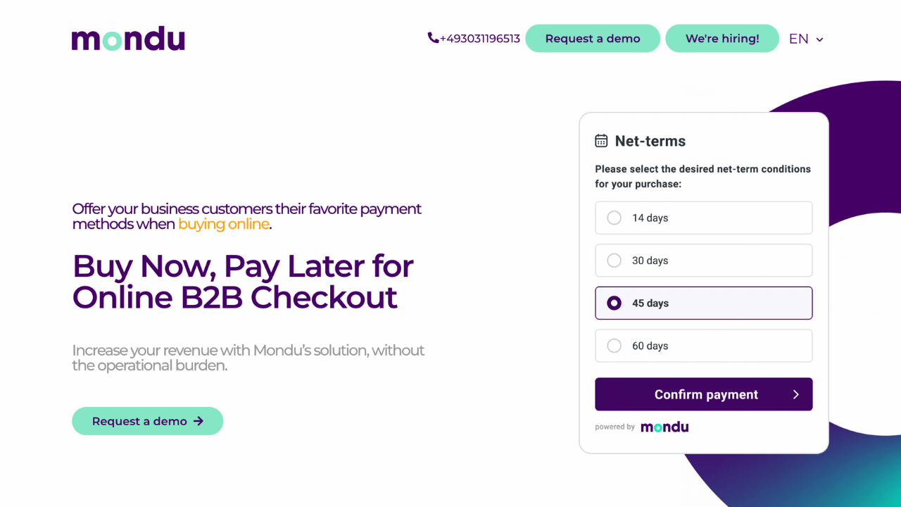 2021 yılında Gil Danziger, Malte Huffmann ve Philipp Povel tarafından hayata geçirilen Mondu, B2B pazar yerlerine ve satıcılara, genellikle süreçle ilişkili finansal ve operasyonel sıkıntılar olmadan net koşullara sahip esnek bir ödeme yöntemi sunuyor. Şirket, Ekim 2021'den bu yana güzellik, temizlik ve imalat gibi sektörlerde hizmet veren markalara ve pazar yerlerine hizmet veriyor.