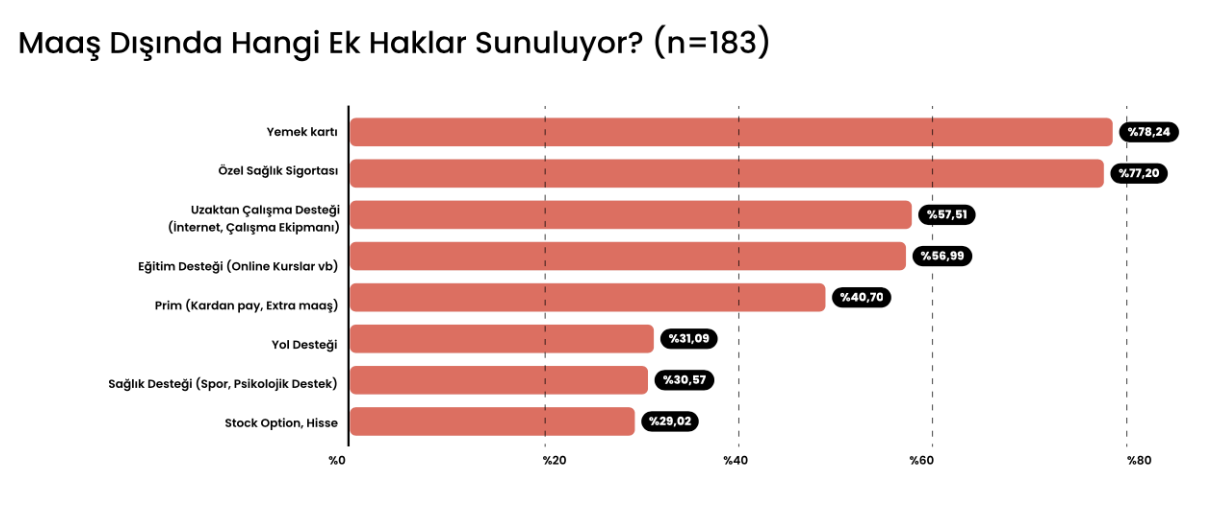 Standart yan haklara ek olarak şirket karına ortaklık, hisse ortaklığı gibi sahiplik hissini arttıracak haklar katılımcıların en az 1⁄3’ünün paketinde bulunuyor. Çoğunluk eğitim ve uzaktan çalışma desteği alıyor, sağlık desteği de %30 civarlarında.