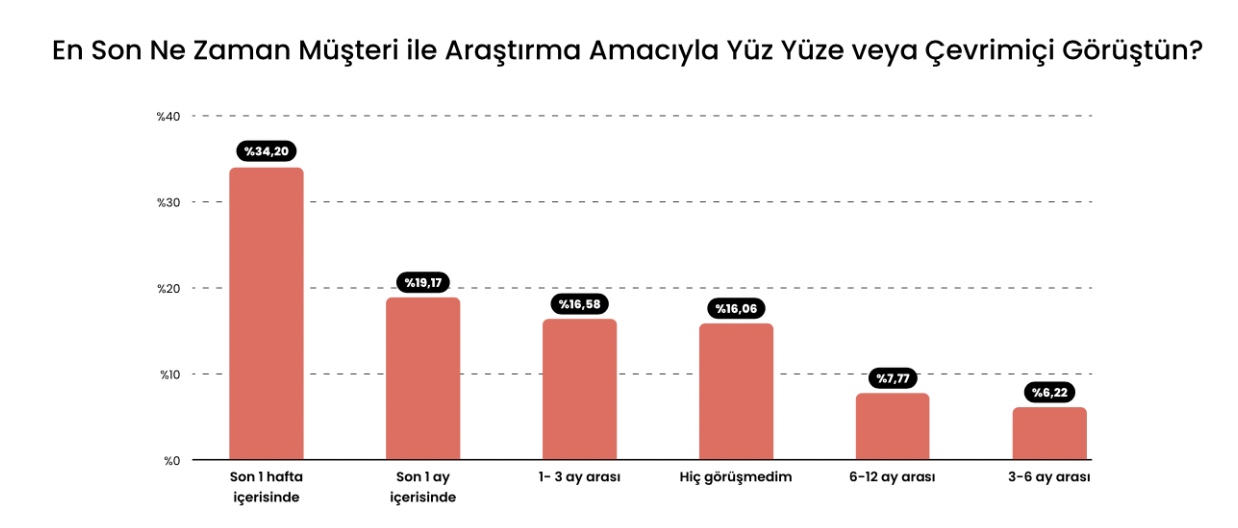 Her 3 katılımcıdan biri son 1 hafta içinde kullanıcıları ile araştırma amacıyla görüştüğünü ifade ediyor. %16’sı daha önce hiç bir kullanıcıyla görüşmemiş. Ürün yöneticilerinin kıdem düzeyine ve tabii oldukları para birimine göre kazançları, yöneticileriyle olan ilişkileri, çalışıyor oldukları organizasyonun ürün geliştirme pratikleri ve süreç tercihleri, proje ve veri analizi için kullandıkları araçlara kadar onlarca başlıkta ekosistemin durumunu aşağıdaki linkten inceleyebilirsiniz. Raporun tamamını buradan inceleyebilirsiniz.