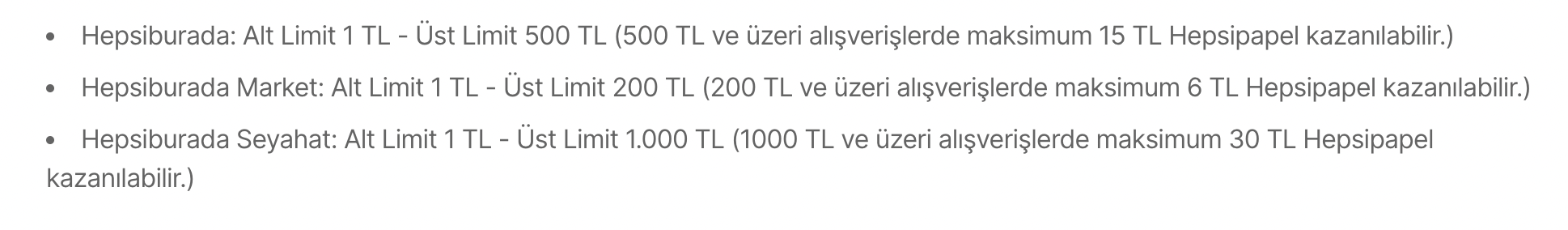 Hepsiburada Premium ile Hepsipapel'de kazanılabiliyor. Ancak bunun belirli şartları bulunuyor. Hepsipapel tutarları, aşağıda aralıkları belirtilen alışveriş tutarları için geçerli olacak şekilde belirtiliyor. Üst limitin yukarısında yapılan alışverişlerde üst limitin yüzde 3'ü kadar Hepsipapel kazanılıyor. Minimum limitin altında kalan alışverişler Hepsipapel kazanımına dahil edilmiyor.