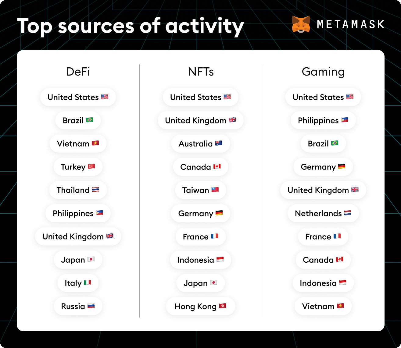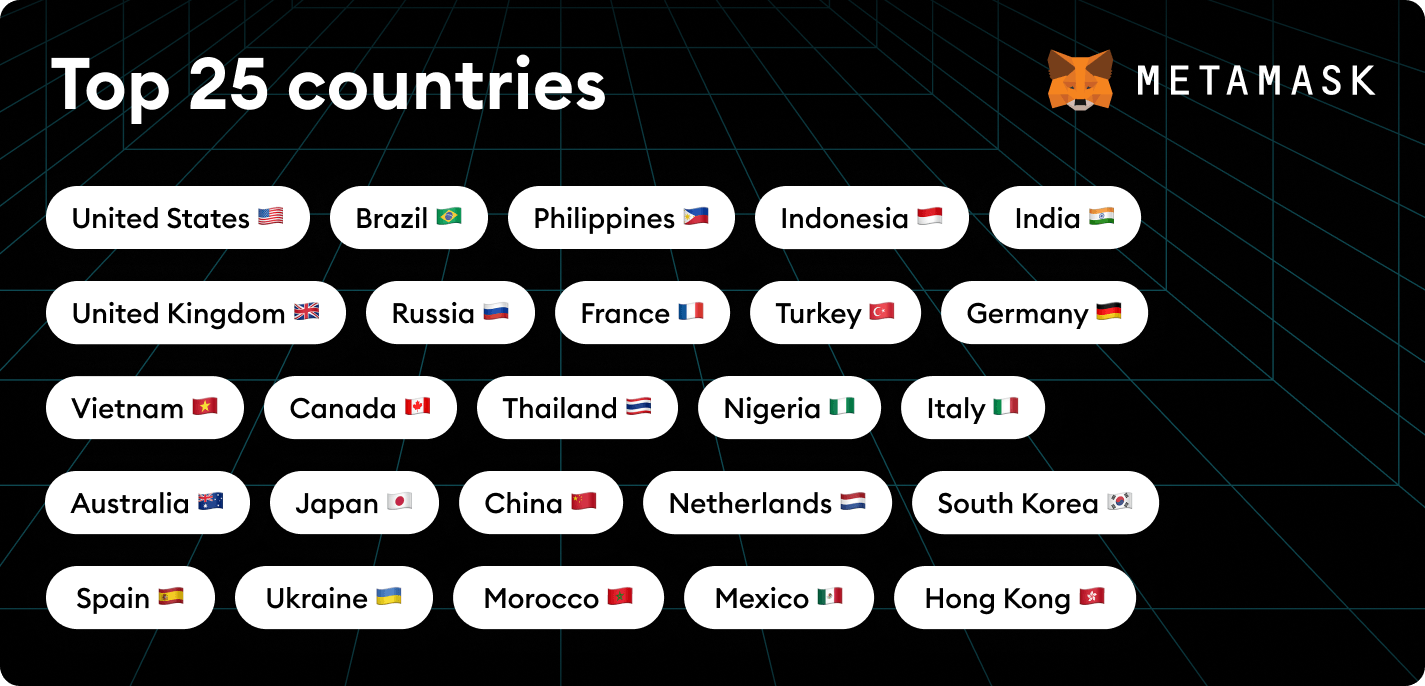2022'nin ilk çeyreğinin sonundaki verilere dayanılarak, MetaMask'ın en çok kullanıma sahip 25 ülkesini aşağıdaki listede bulabilirsiniz. Türkiye'nin de yer aldığı listede aylık aktif kullanıcıların göz önünde tutulduğunu da belirtelim.