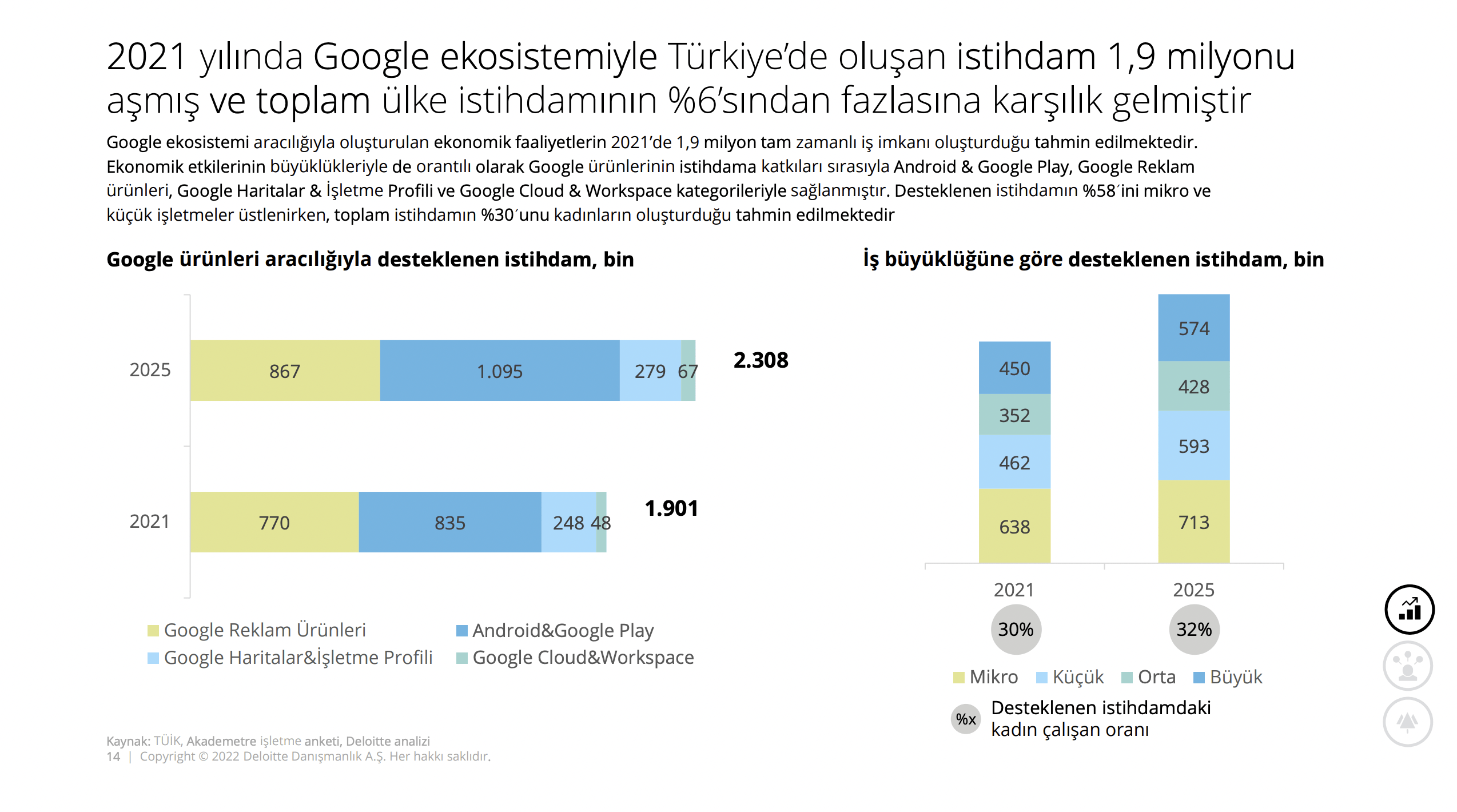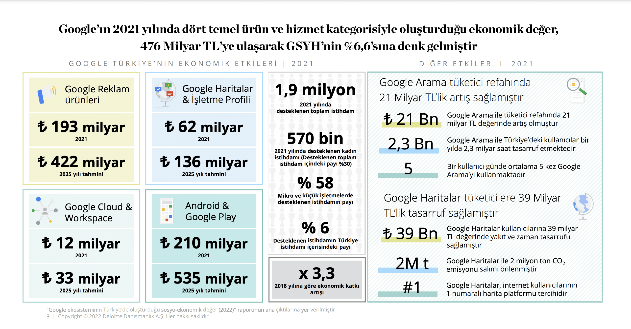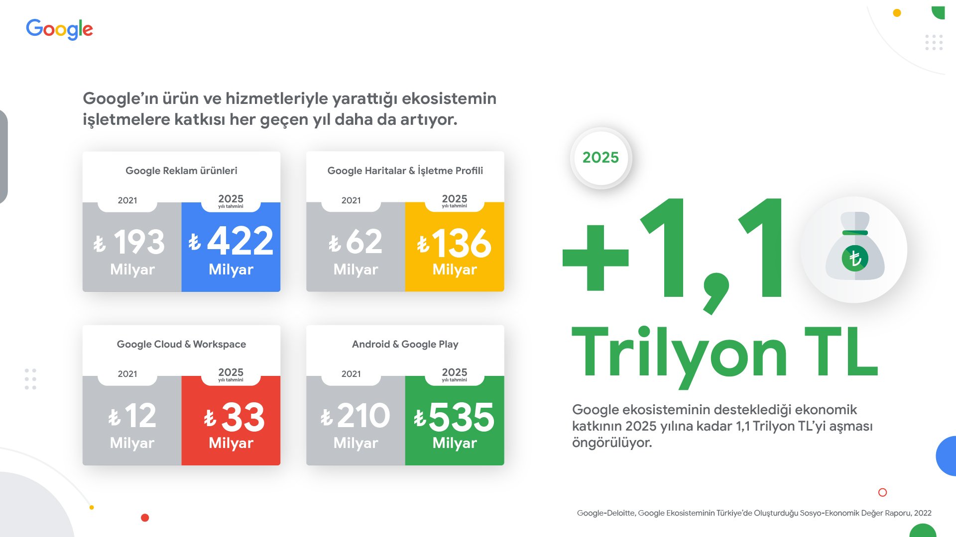 Rapora göre Google’ın 2021 yılında dört temel ürün ve hizmet kategorisiyle oluşturduğu ekonomik değer 476 milyar TL’ye ulaştı ve GSYH’nin yüzde 6,6’sına denk geldi. 2018’de yapılan rapor ile kıyaslandığında Google’ın ekonomik katkısı 3,3 kat artarken bu katkının 2025’te 1,1 trilyon TL’yi aşması bekleniyor.