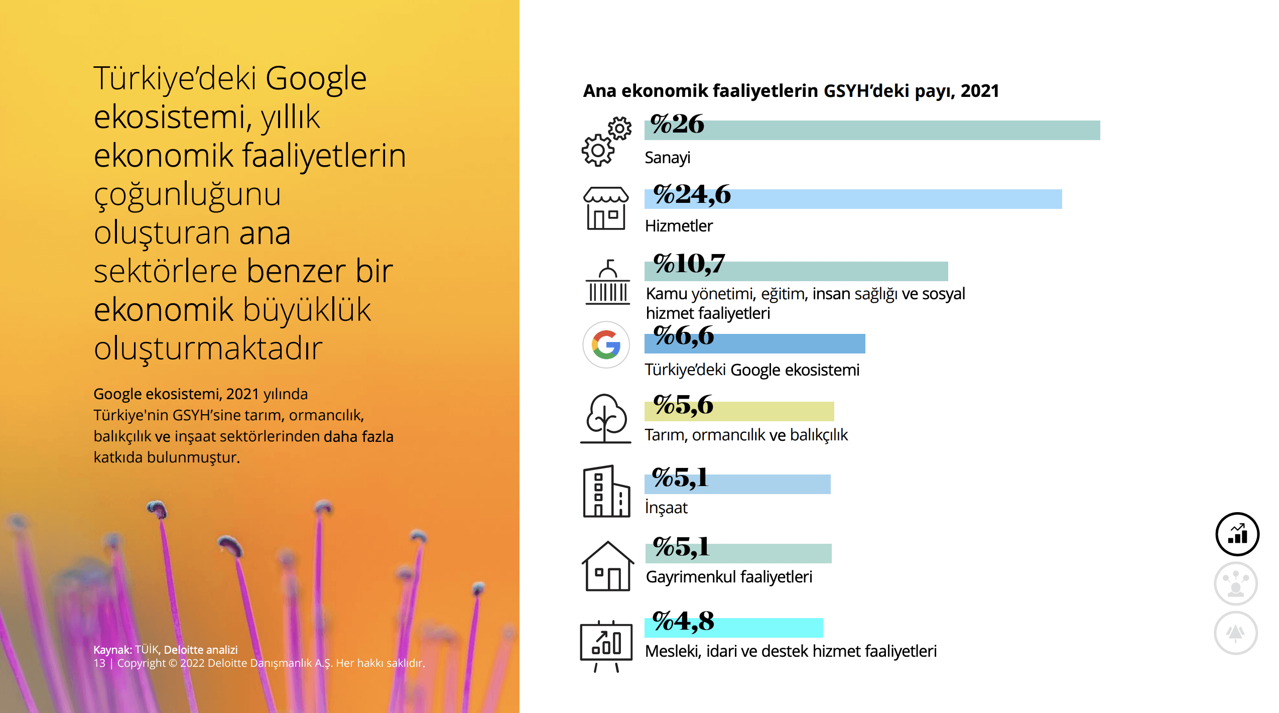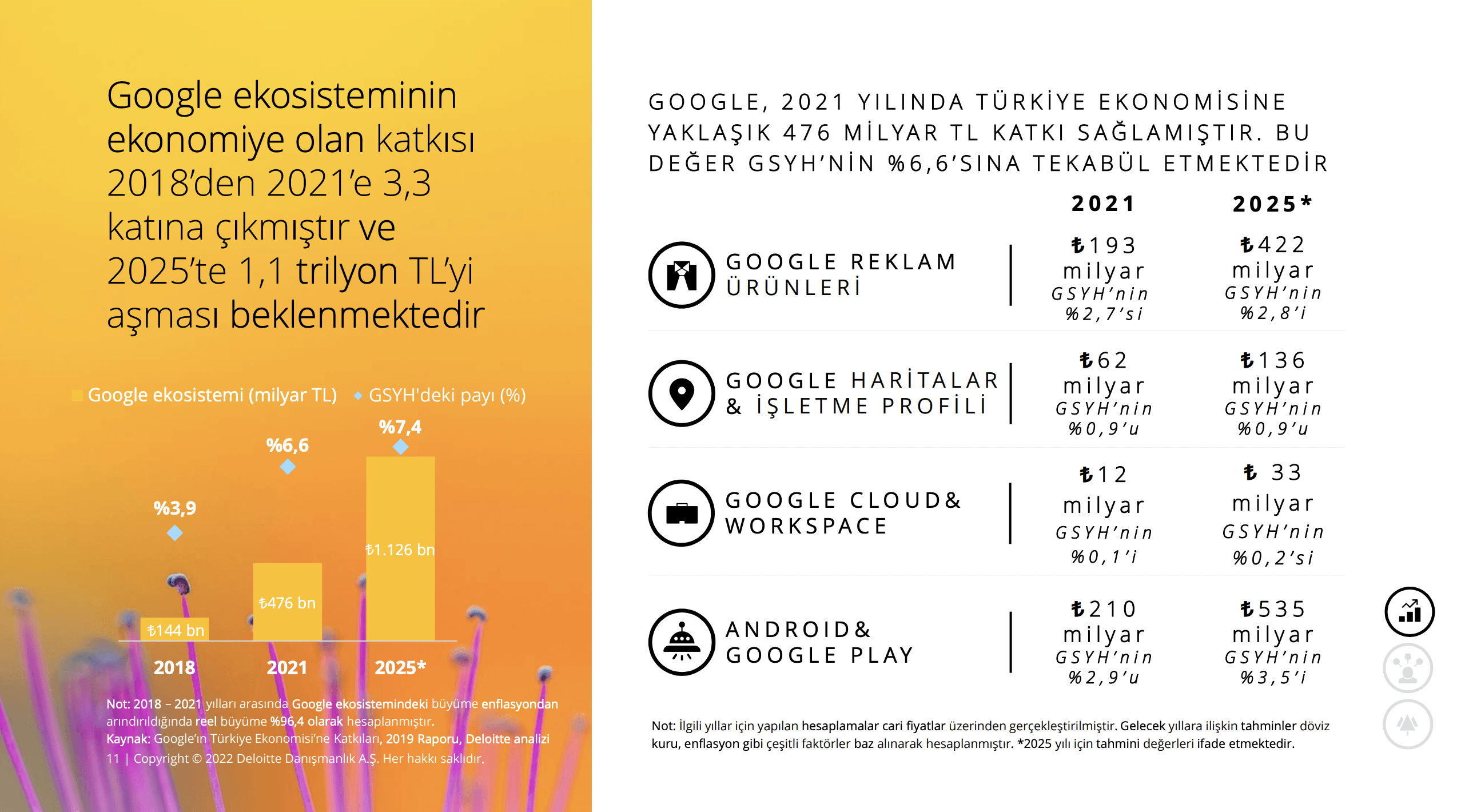 Google’ın 2021 yılında dört temel ürün ve hizmet kategorisiyle oluşturduğu ekonomik değer, 476 milyar TL’ye ulaşarak GSYH’nin yüzde 6,6’sına denk geldi. 2018’de GSYH’nin yüzde 3,9’una tekabül eden bu rakamın 2025 yılında yüzde 7,4’e ulaşacağı öngörülüyor.