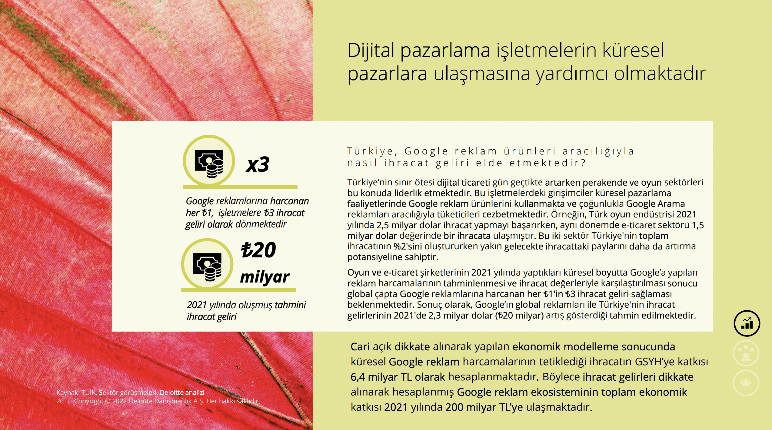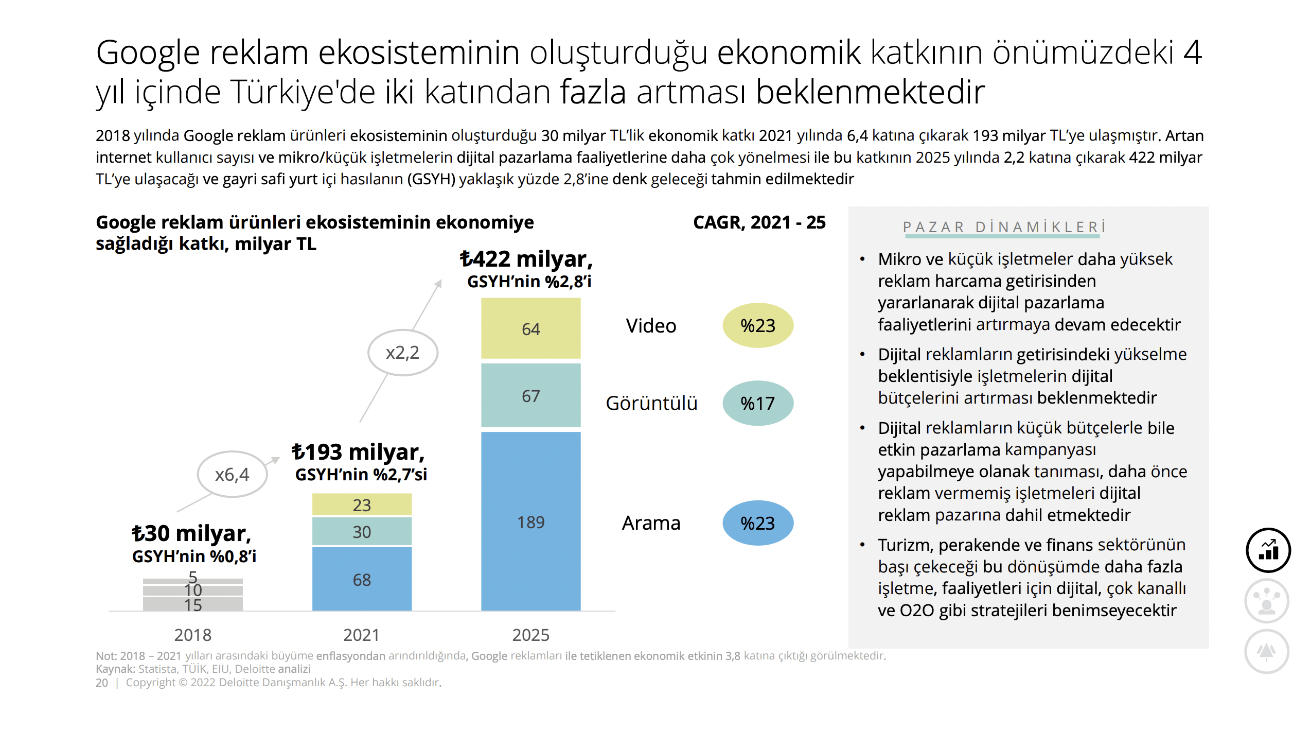 Google reklam ekosisteminin oluşturduğu ekonomik katkının önümüzdeki 4 yıl içinde Türkiye'de iki katından fazla artması bekleniyor. Google reklam ürünleri sayesinde fiziksel mağaza müşterilerinde yüzde 25 artış yaşandı. Google reklamlarına harcanan her 1 TL işletmelere 3 TL ihracat geliri olarak dönüyor.