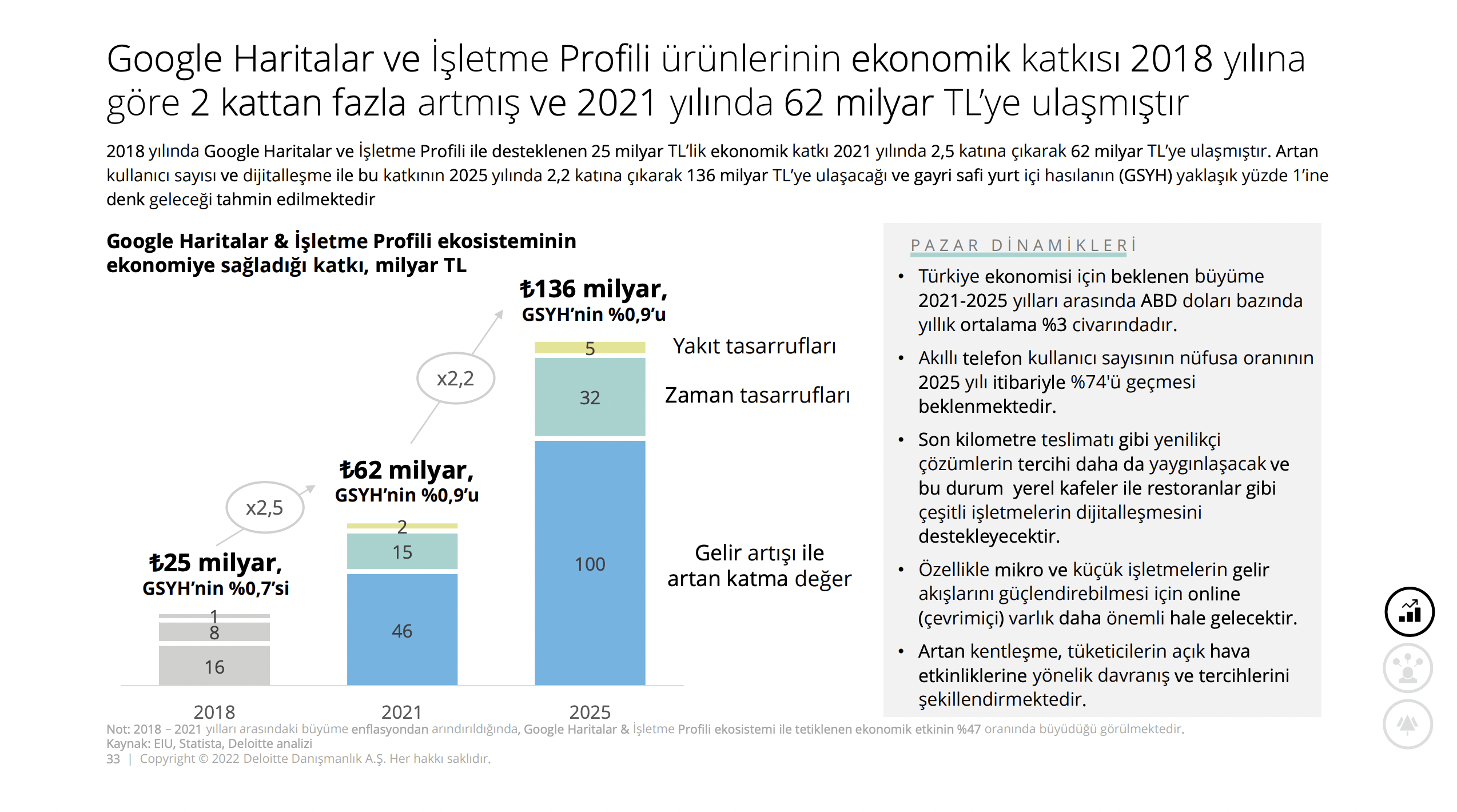 Google Haritalar ve Google İşletme Profili’nin ekonomik etkisi ise 62 milyar TL olarak öne çıkıyor. 2025 yılında bu sayının 136 milyara ulaşacağı öngörülüyor.