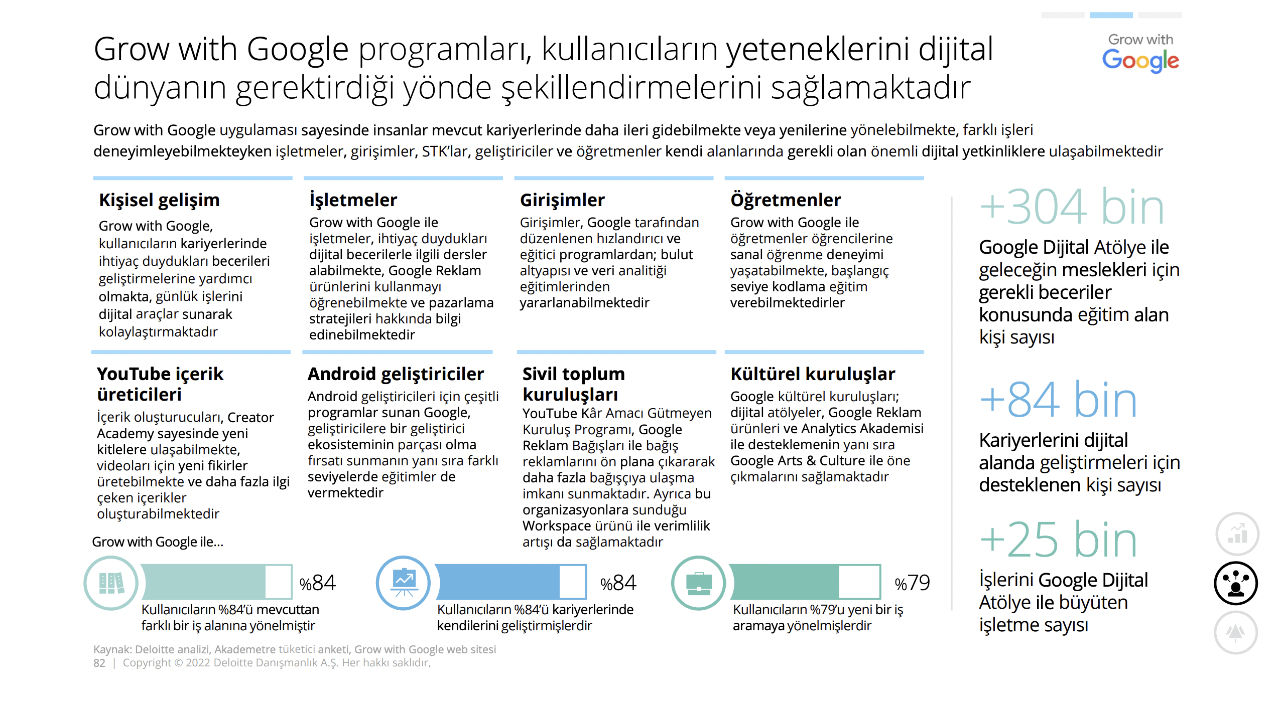 Ücretsiz eğitim programları sunan Grow with Google programı, faydalanan kullanıcıların yüzde 84’ünün mevcuttan farklı bir iş alanına yönelmesine destek olurken ve 304 bin kişinin eğitim aldığı, 84 bin kişinin kariyerini dijital alanda geliştirmeleri için desteklendiği ve 25 bin işletmenin işlerini büyüttüğü Google Dijital Atölye, sosyal refaha katkı sağlayan Google araçları arasında yer alıyor.