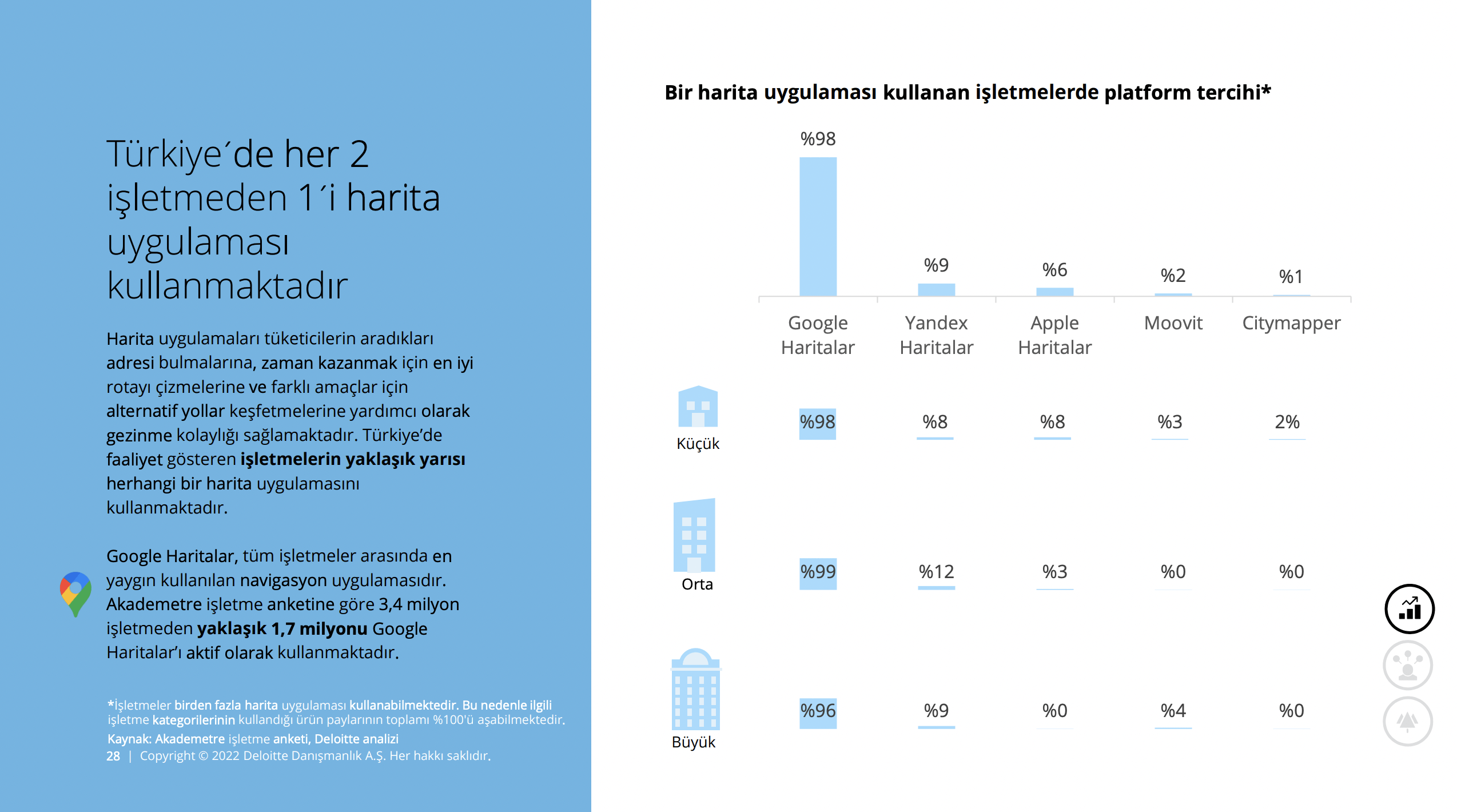Rapordaki Akademetre işletme anketine göre 3,4 milyon işletmeden yaklaşık 1,7 milyonu Google Haritalar’ı aktif olarak kullanıyor. Ayrıca Türkiye’de her 4 firmadan 1’i Google Haritalar ile entegre çalışabilen Google hizmetlerinden firma tanıtım ürünlerini kullanıyor.