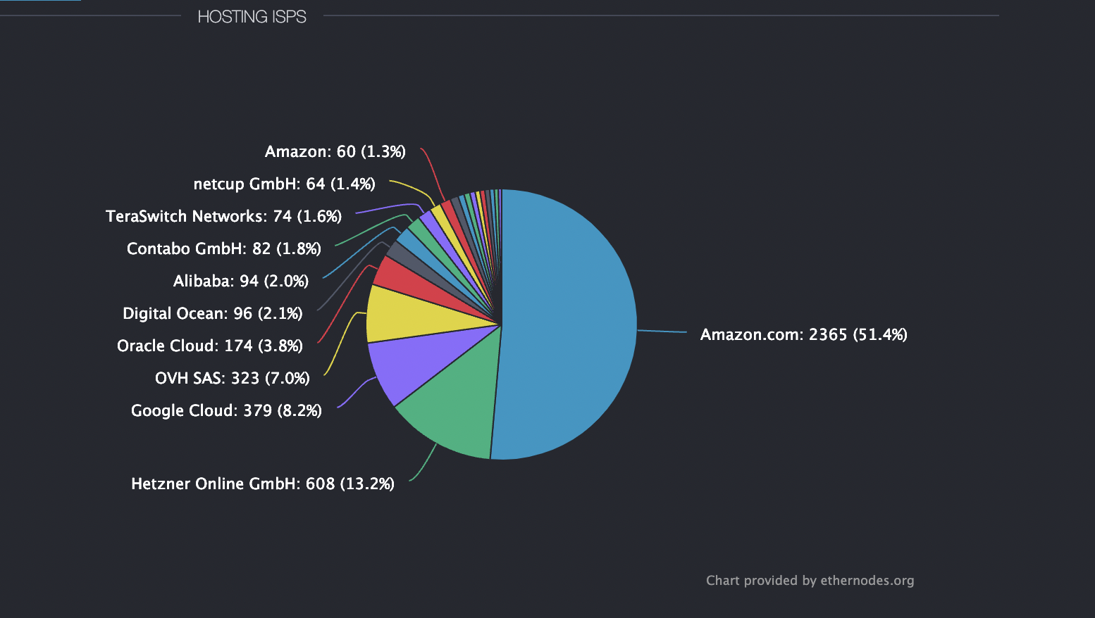 Ethernodes verilerine göre Ethereum Hosting'inin yüzde 51.4'ü Amazon, yüzde 13.3 Hetzner ve yüzde 8.2'si Google Cloud'a ait.