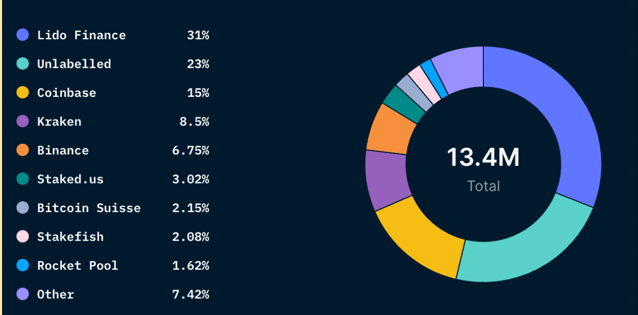 Yine Nansen'in paylaştığı verilere göre Cuma akşamı 422 binden fazla onaylayıcı 22.3 milyar değerindeki 13.5 milyon ETH'i Beacon Chain'e aktardı. Bu söz konusu miktarın yüzde 30'u Lido'ya, Yüzde 15'i Coinbase'e yüzde 8'i kraken'e ve yüzde 7'si Binance'e ait. Böyle bakıldığında stake edilen Ethereum miktarının yüzde 60'ının bu dört kurumda tutulduğunu görmekteyiz.