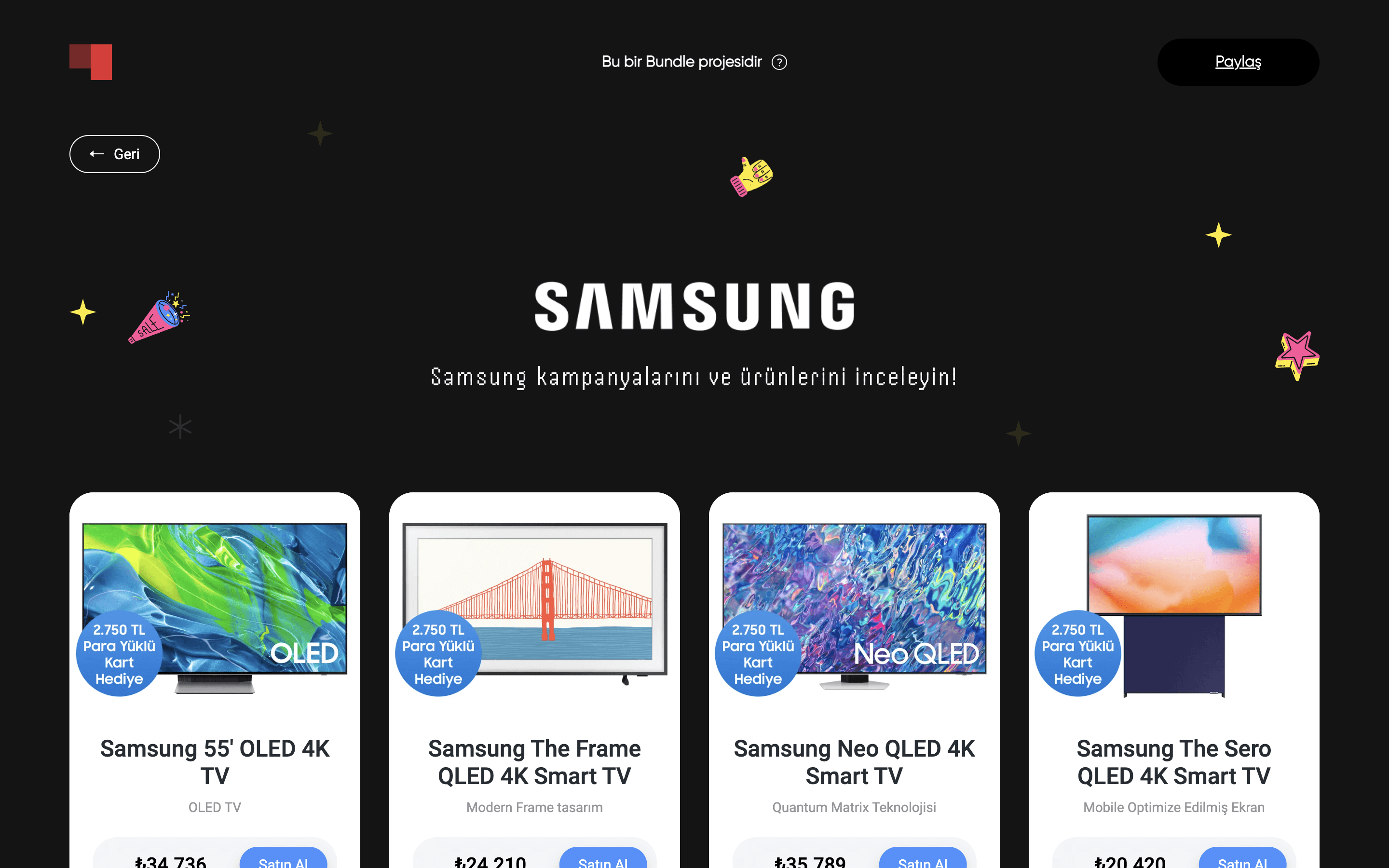 Markalar, bu kapsamda Bundle ile iş birliği yapıyor ve bu iş birliği ile direkt olarak kampanya yönlendirmesi değil, ürünlerin satın alınmasına yönelik yönlendirmeler yapılıyor. Bundle Pop-up Store'a göz attığımızda L'Oréal, Samsung, Yapı Kredi, United Colors of Benetton gibi markalar ile karşılaşıyoruz. Her bir markanın üzerine tıkladığımız zaman bizi o markaların belirli ürünleri karşılıyor.