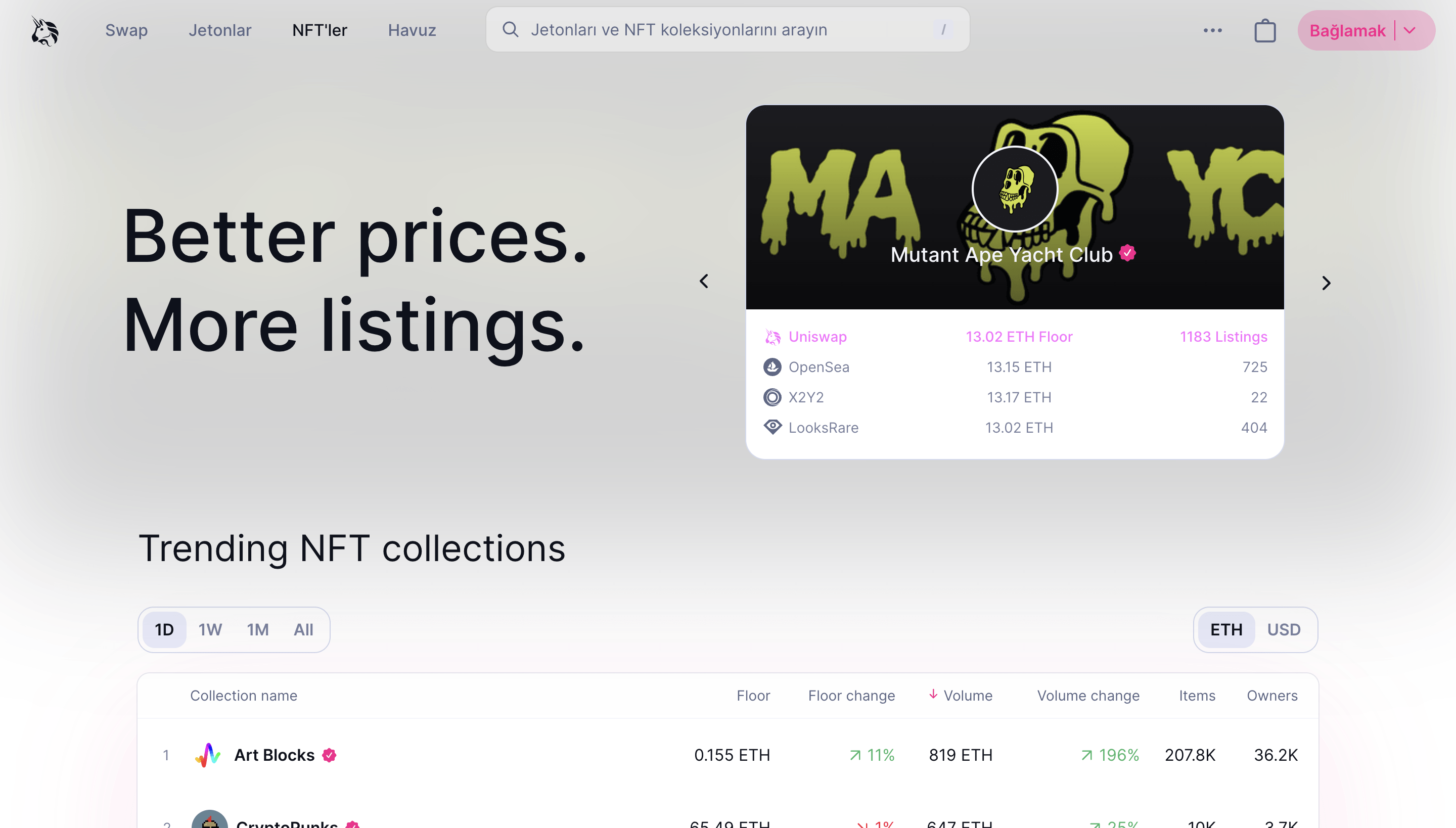 Bu yeni değişiklikle birlikte Uniswap, OpenSea, X2Y2, Sudoswap ve LooksRare dahil olmak üzere pek çok NFT pazar yerindeki NFT'leri alıp satmanızı sağlayacak. Uniswap'ın NFT'ler sekmesi altında, CryptoPunks, Bored Ape Yatch Club, Azuki tanınmış koleksiyonlara erişebiliyorsunuz.