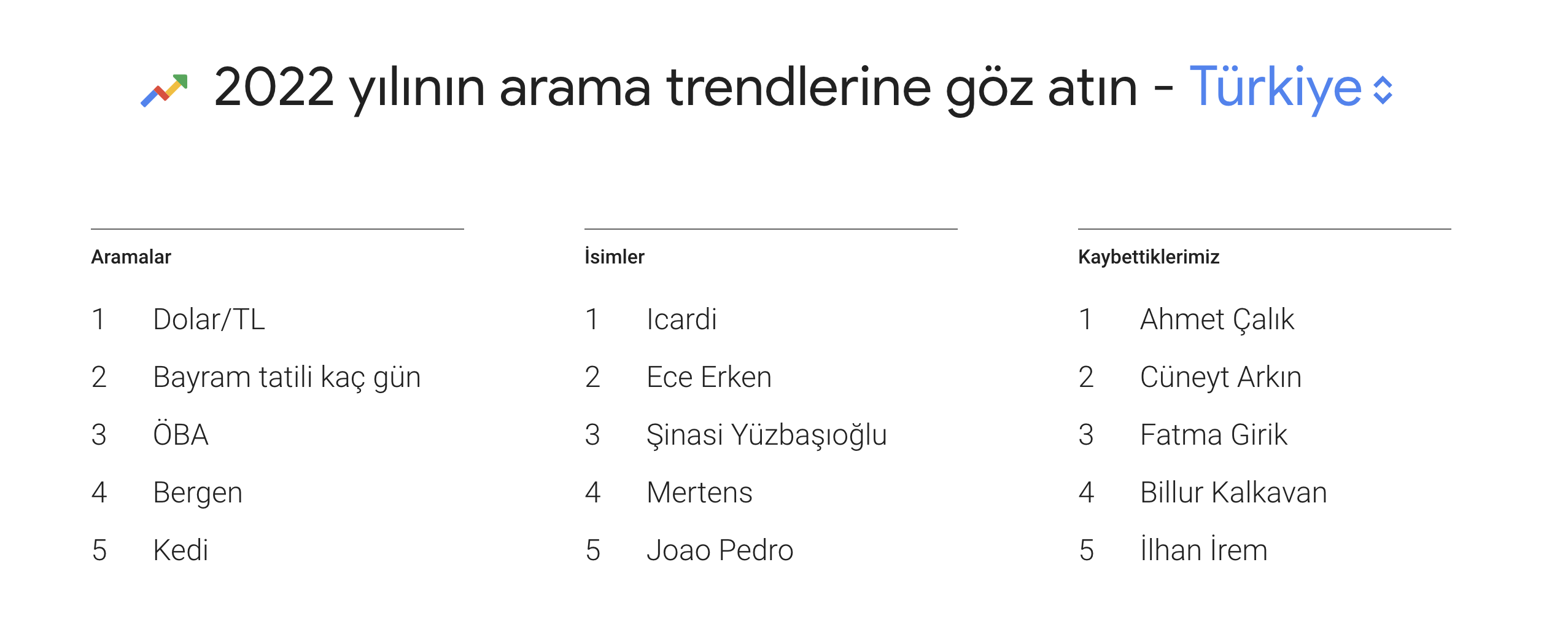 2022 yılında Türkiye, Google'da en çok "Dolar/TL" terimini arattı. "Dolar/TL" terimini sırasıyla Bayram tatili kaç gün, ÖBA, Bergen ve Kedi terimleri takip etti. Google'da en çok aratılan isimler ise Icardi, Ece Erken, Şinası Yüzbaşıoğlu, Mertens ve Joao Pedro oldu.