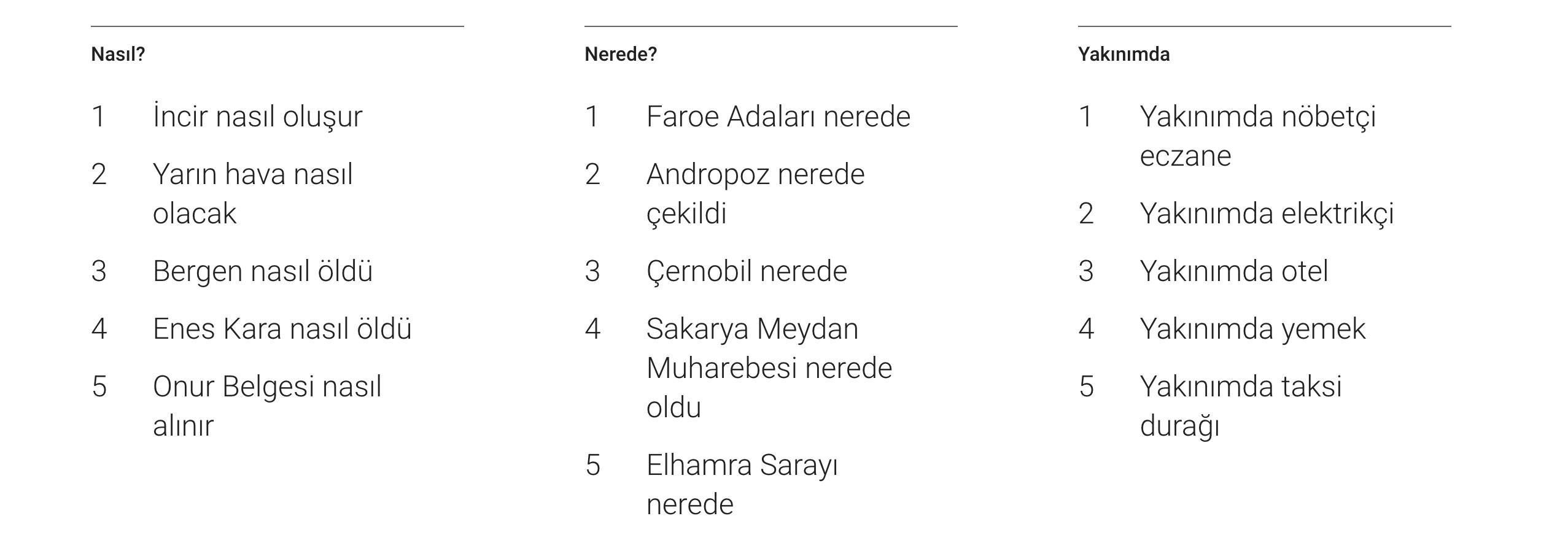 Nerede kategorisinde ise Faroe Adaları, Andropoz çekim mekanı, Çernobil, Sakarya Meydan Muharebesi ve Elhamra Sarayı'nın aratıldığını görüyoruz. İhtiyaç anında yakınındaki mekan ve hizmetleri bulmak için Google'a başvuran Türkiye kullanıcısı, en çok nöbetçi eczane, elektrikçi, otel, yemek ve taksi durağı arattı.