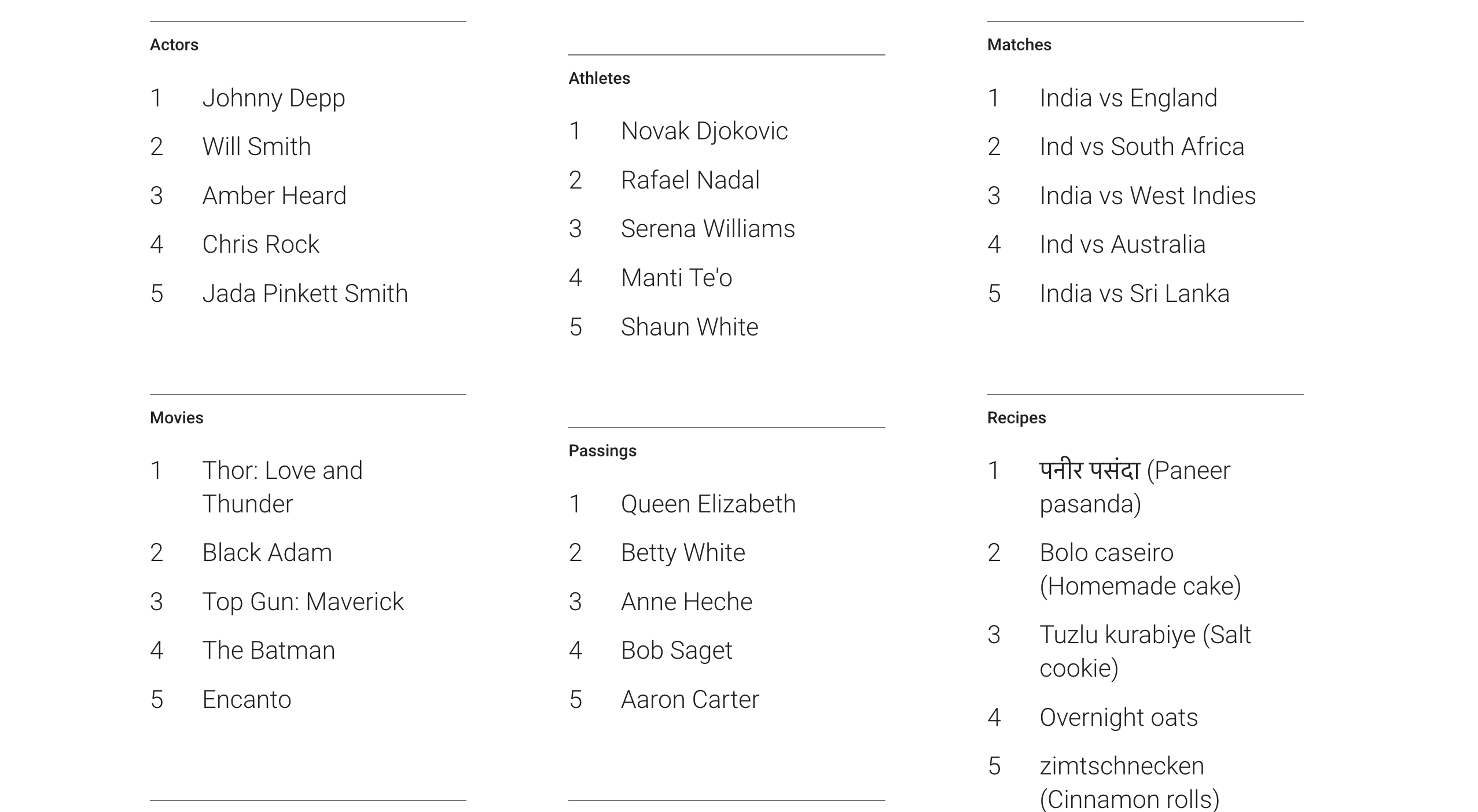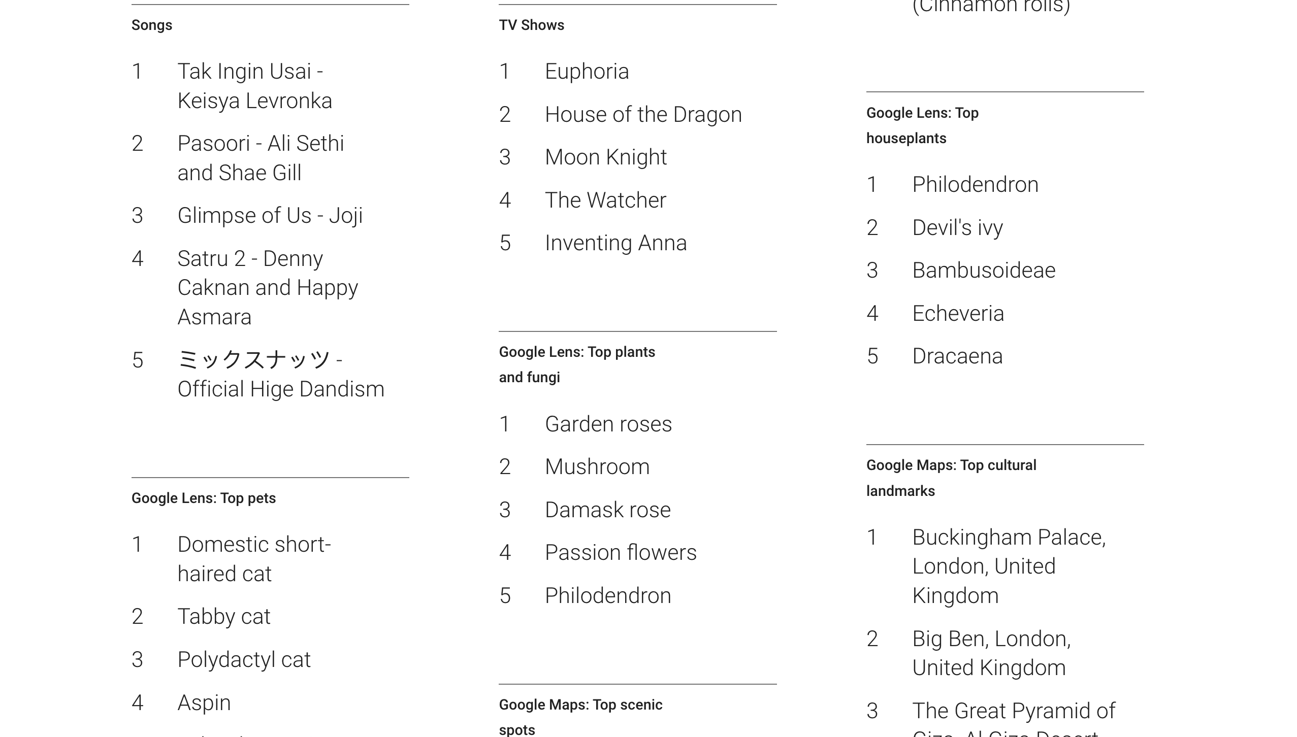 2022'de dünya çapında Google'da en çok aratılan diziler, Euphoria, House of the Dragon, Moon Knight, Inventing Anna olarak öne çıktı. Google aramalarında ilk 5'te yer alan ünlü kent simgeleri ise sırasıyla Buckingham Sarayı, Big Ben, Gize Piramitleri, Kurtarıcı İsa Heykeli ve Brüksel Kraliyet Sarayı oldu.