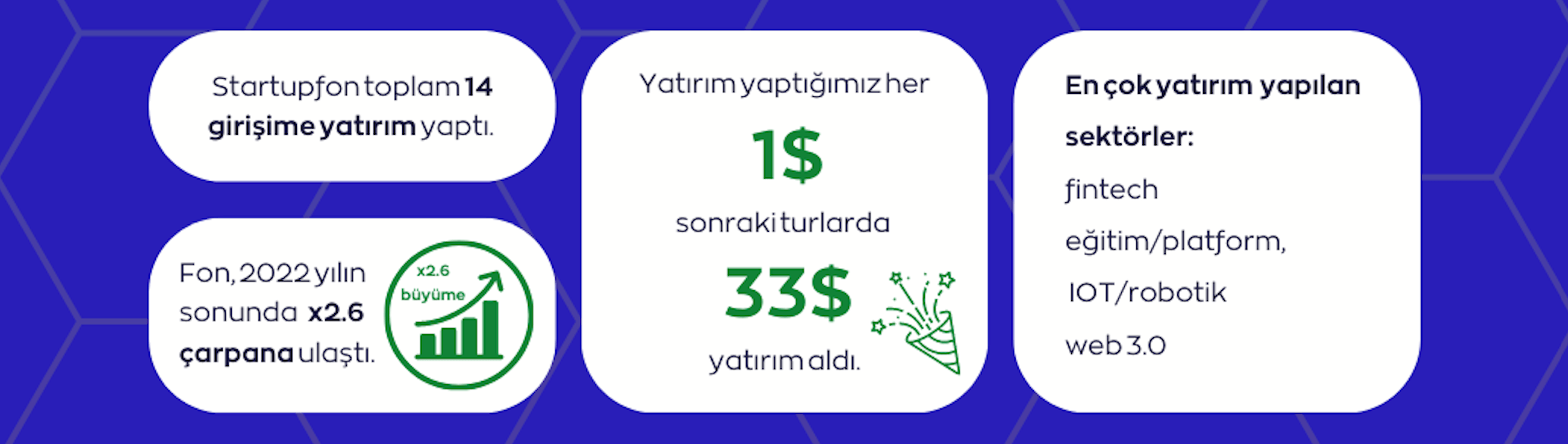 Fon'un yatırım yaptığı her 1 dolar karşılığına portföydeki girişimlerin sonraki turlarda 33 dolar değerinde yatırım aldığını da ekleyelim. Startupfon'un 2022 yılında gerçekleştirdiği yatırımlara baktığımızda ise en çok yatırım yapılan sektörler olarak karşımıza fintech, eğitim / platform, nesnelerin interneti, robotik ve Web3 sektörleri çıkıyor.