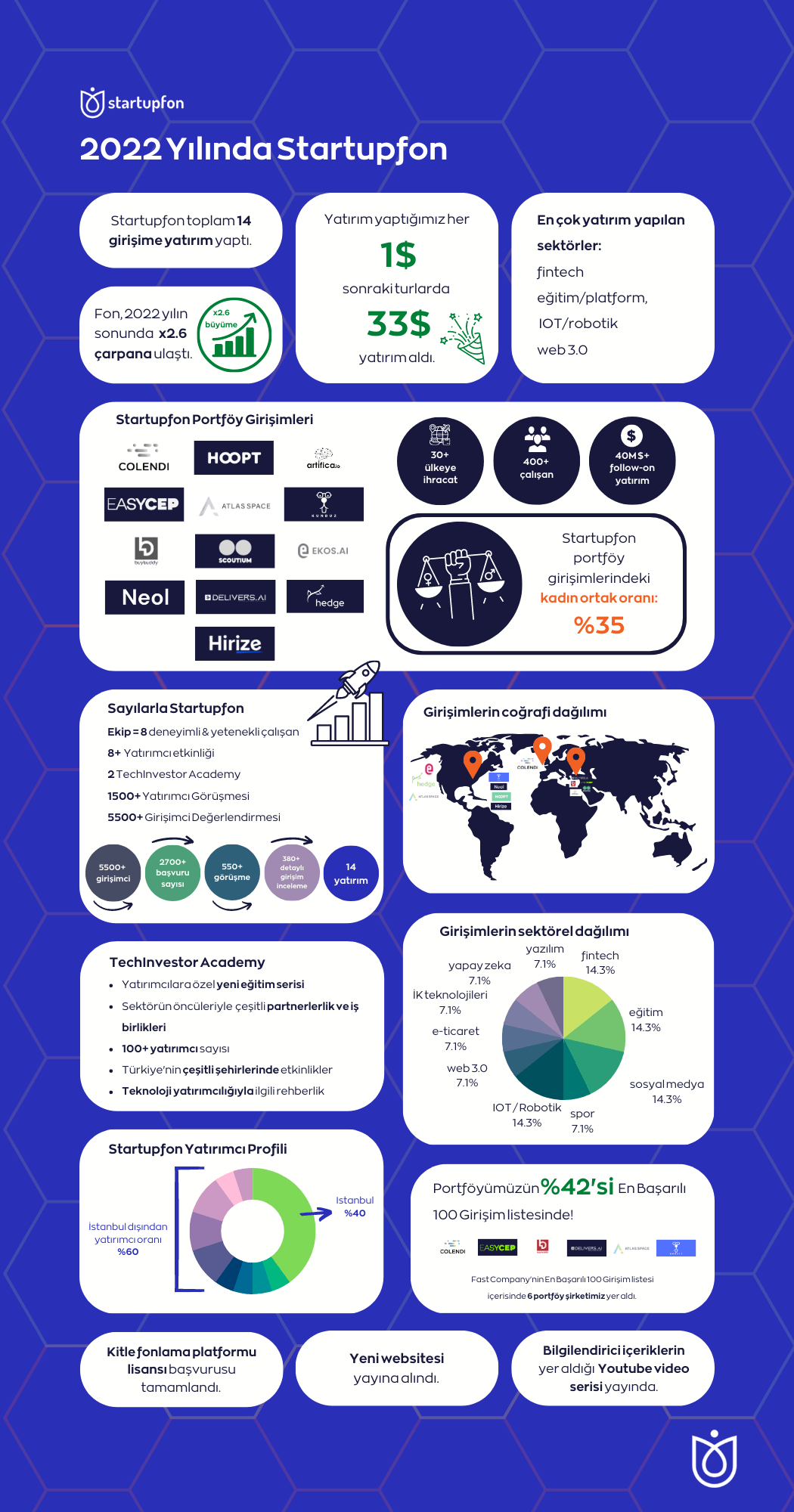 Startupfon'un yatırımcı istatistiklerine bakıldığında, yatırımcıların yaklaşık yüzde 60’ının İstanbul dışından olduğunu da paylaşalım. 2022 yılında yatırımcılara özel yeni eğitim serisi olan “TechInvestor Academy” etkinlik serisine de başlayan Startupfon'un İstanbul ve Ankara başta olmak üzere Türkiye’nin çeşitli şehirlerinde düzenlenen etkinliklerine 100’den fazla yatırımcı ve potansiyel yatırımcı da katıldı.