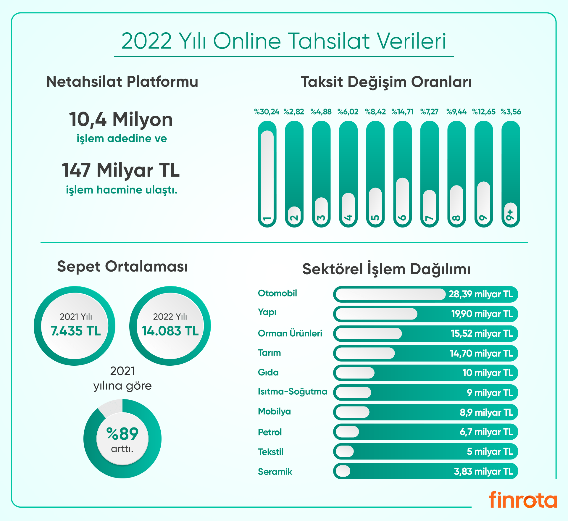 Firmaların online tahsilat yapılabilmesine odaklanan Netahsilat tarafından aktarılan bilgilere göre şirket, 2022 yılında 10,4 milyon adet işlem ve 147 milyar TL tahsilat gerçekleştirdi. Netahsilat'ın 2022 verilerine baktığımızda otomobil sektörünün tahsilat hacmi konusunda ilk sırada olduğunu görüyoruz.