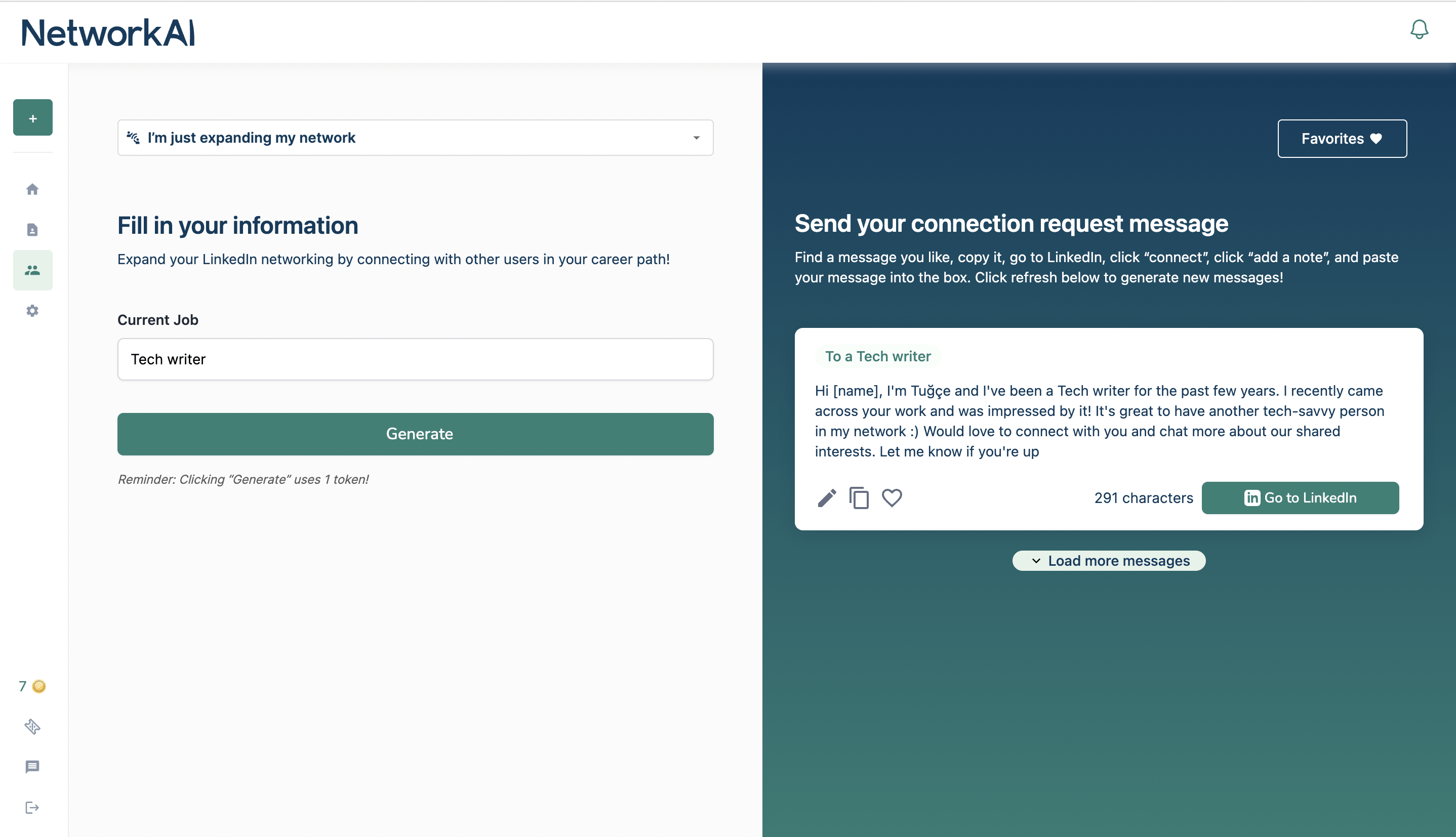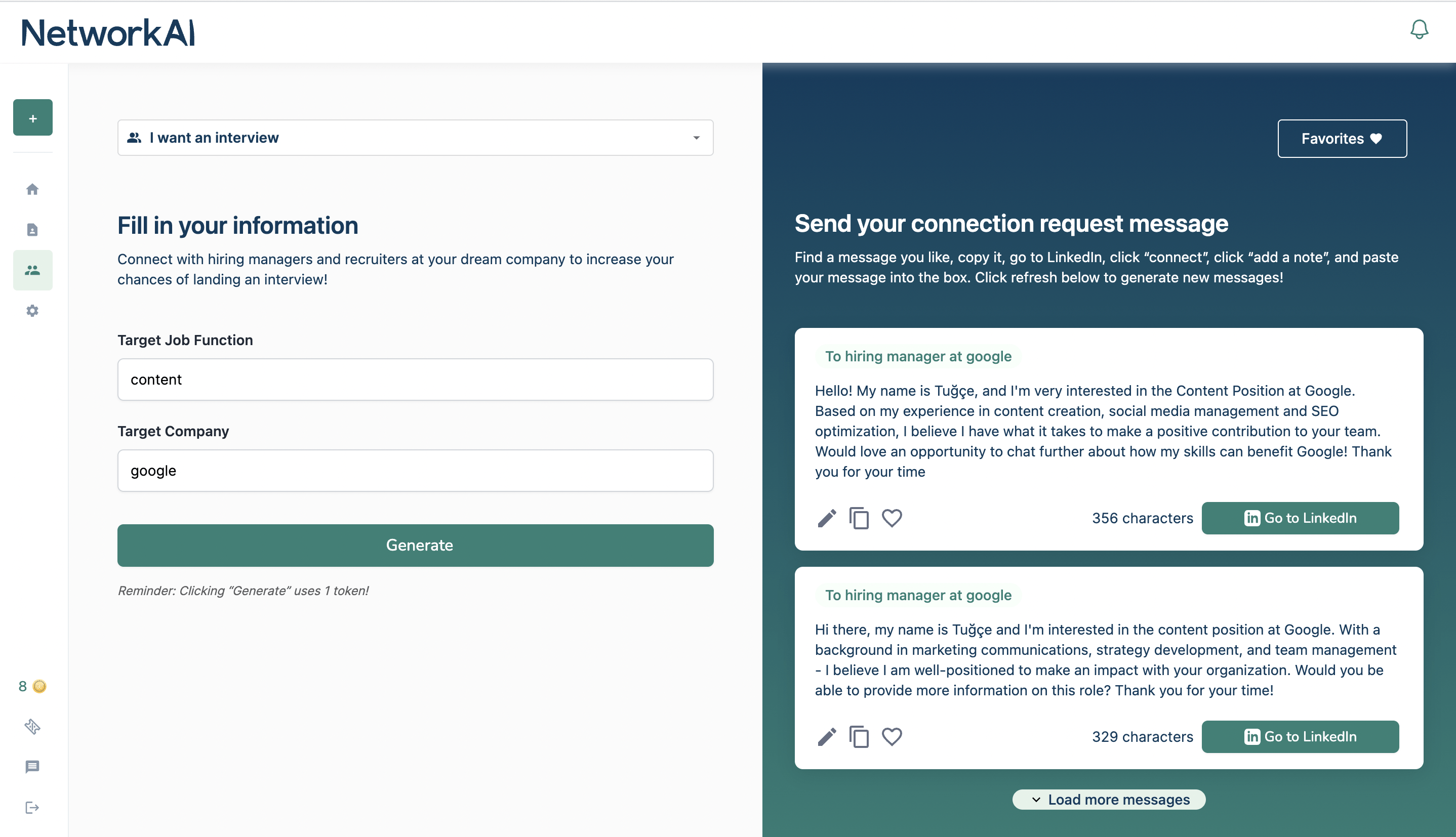 Üretilen metinleri doğrudan düzenleyebilir, kopyalayabilir ve kaybolmaması için favorilerinize ekleyebilirsiniz. Mesajların sağ alt kısmında bulunan LinkedIn'e git butonuna tıkladığınızda, Network AI, sizin için oluşturduğu anahtar kelimelerle arama yapıyor.