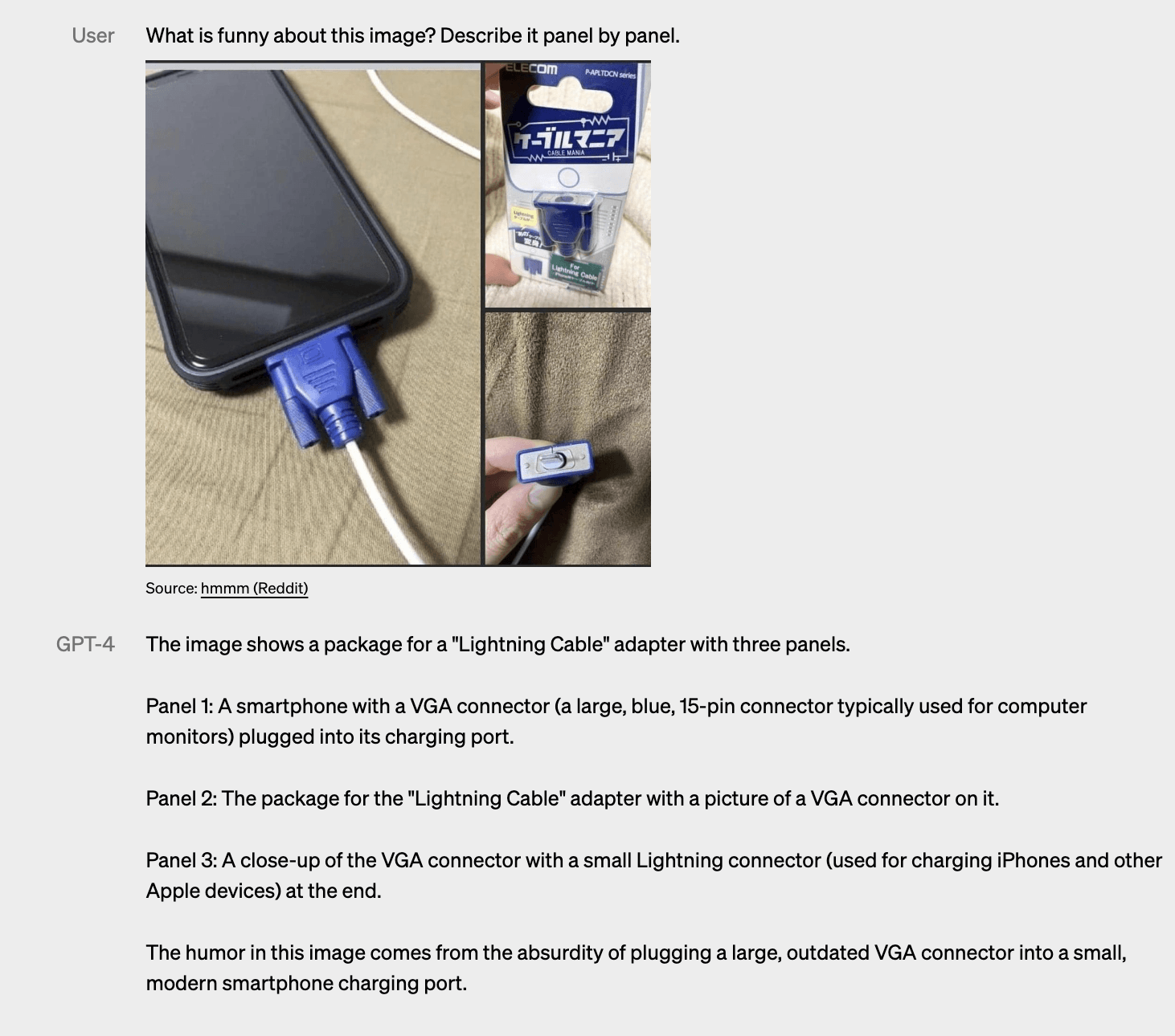 Bunlara ek olarak GPT-4, metne dayalı komutların yanı sıra görsel girdilerini de kabul ediyor. Open AI'ın web sitesinde kullanılan görsel örnek, bu yeteneği çok güzel özetliyor. GPT-4, görsel olarak yapılan esprileri adım adım açıklayabiliyor.